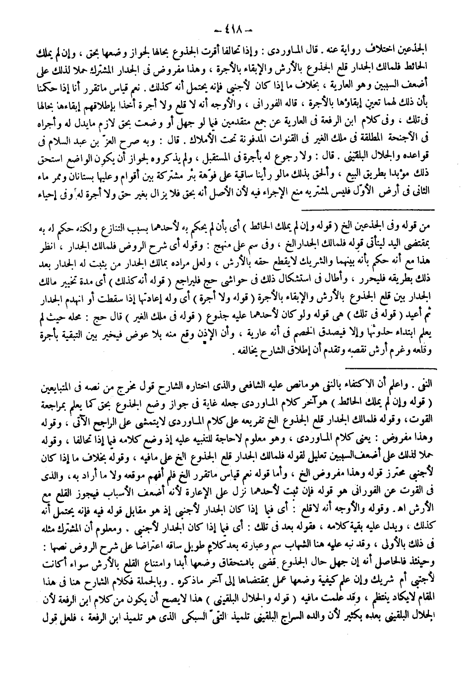 وَقَوْلُهُ: وَالْأَوْجَهُ أَنَّهُ لَا قَلْعَ: أَيْ فِيمَا إذَا كَانَ الْجِدَارُ لِأَجْنَبِيٍّ إذْ هُوَ مُقَابِلُ قَوْلِهِ فِيهِ فَإِنَّهُ يَحْتَمِلُ أَنَّهُ كَذَلِكَ، وَيَدُلُّ عَلَيْهِ بَقِيَّةُ كَلَامِهِ، فَقَوْلُهُ: بَعْدُ فِي تِلْكَ: أَيْ فِيمَا إذَا كَانَ الْجِدَارُ لِأَجْنَبِيٍّ، وَمَعْلُومٌ أَنَّ الْمُشْتَرَكَ مِثْلُهُ فِي ذَلِكَ بِالْأَوْلَى، وَقَدْ نَبَّهَ عَلَيْهِ هُنَا الشِّهَابُ سم وَعِبَارَتُهُ بِهِ كَلَامٌ طَوِيلٌ سَاقَهُ اعْتِرَاضًا عَلَى شَرْحِ الرَّوْضِ نَصُّهَا: وَحِينَئِذٍ فَالْحَاصِلُ أَنَّهُ إنْ جَهِلَ حَالَ الْجُذُوعِ قُضِيَ بِاسْتِحْقَاقِ وَضْعِهَا أَبَدًا وَامْتِنَاعِ الْقَلْعِ بِالْأَرْشِ سَوَاءٌ أَكَانَتْ لِأَجْنَبِيٍّ أَمْ شَرِيكٍ وَإِنْ عَلِمَ كَيْفِيَّةَ وَضْعِهَا عَمِلَ بِمُقْتَضَاهَا إلَى آخِرِ مَا ذَكَرَهُ، وَبِالْجُمْلَةِ فَكَلَامُ الشَّارِحِ هُنَا فِي هَذَا الْمَقَامِ لَا يَكَادُ يَنْتَظِمُ وَقَدْ عَلِمْتَ مَا فِيهِ. (قَوْلُهُ: وَالْجَلَالُ الْبُلْقِينِيُّ) هَذَا لَا يَصِحُّ أَنْ يَكُونَ مِنْ كَلَامِ ابْنِ الرِّفْعَةِ؛ لِأَنَّ الْجَلَالَ الْبُلْقِينِيَّ بَعْدَهُ بِكَثِيرٍ؛ لِأَنَّ وَالِدَهُ السِّرَاجَ الْبُلْقِينِيَّ تِلْمِيذُ التَّقِيِّ السُّبْكِيّ الَّذِي هُوَ تِلْمِيذُ ابْنِ الرِّفْعَةِ، فَلَعَلَّ قَوْلَ