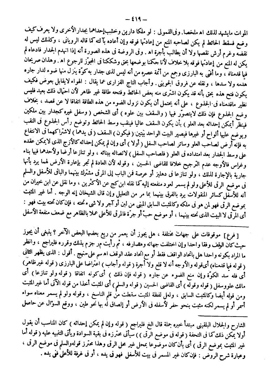 وَهَذَانِ صَرِيحَانِ فِيمَا قَدَّمْنَاهُ، وَمَا أَفْتَى بِهِ الْبَارِزِيُّ وَجَمْعٌ مِنْ أَئِمَّةِ عَصْرِهِ مِنْ أَنَّهُ لَيْسَ لِذِي جِدَارٍ بِهِ كَوَّةٌ يَنْزِلُ مِنْهَا ضَوْءٌ لِدَارِ جَارِهِ هَدْمُهُ وَلَا سَدُّهَا، وَنَقَلَهُ عَنْ فُرُوقِ الْجُوَيْنِيِّ.