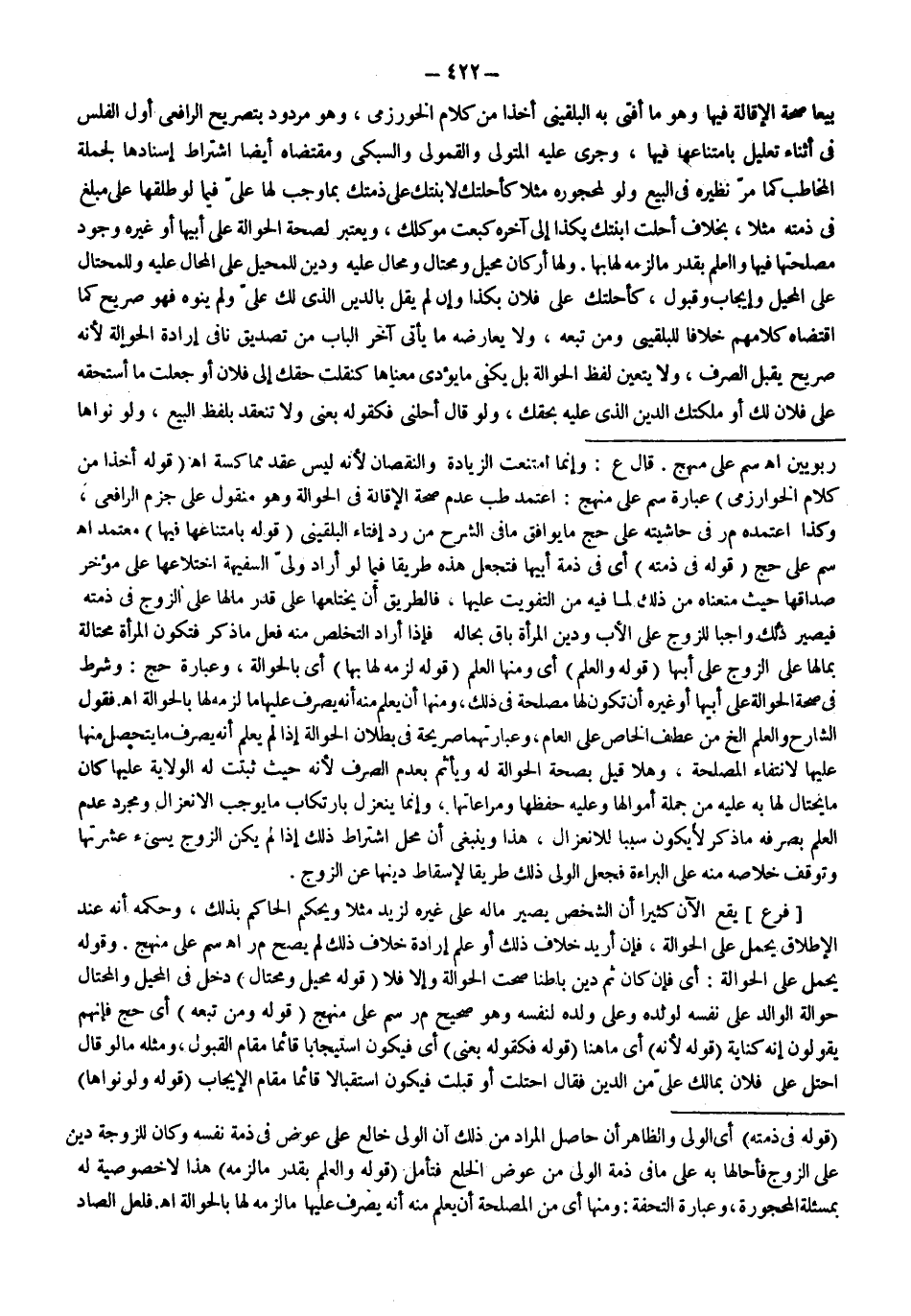 بَيْعًا صِحَّةُ الْإِقَالَةِ فِيهَا، وَهُوَ مَا أَفْتَى بِهِ الْبُلْقِينِيُّ أَخْذًا مِنْ كَلَامِ الْخُوَارِزْمِيَّ، وَهُوَ مَرْدُودٌ بِتَصْرِيحِ الرَّافِعِيِّ أَوَّلَ الْفَلَسِ فِي أَثْنَاءِ تَعْلِيلٍ بِامْتِنَاعِهَا فِيهَا، وَجَرَى عَلَيْهِ الْمُتَوَلِّي وَالْقَمُولِيُّ وَالسُّبْكِيُّ وَمُقْتَضَاهُ أَيْضًا اشْتِرَاطُ إسْنَادِهَا لِجُمْلَةِ الْمُخَاطَبِ كَمَا مَرَّ نَظِيرُهُ فِي الْبَيْعِ وَلَوْ لِمَحْجُورِهِ مَثَلًا كَأَحَلْتُك لِابْنَتِك عَلَى ذِمَّتِك بِمَا وَجَبَ لَهَا عَلَيَّ فِيمَا لَوْ طَلَّقَهَا عَلَى مَبْلَغٍ فِي ذِمَّتِهِ مَثَلًا، بِخِلَافِ أَحَلْت ابْنَتَك بِكَذَا إلَى آخِرِهِ كَ بِعْت مُوَكِّلَك، وَيُعْتَبَرُ لِصِحَّةِ الْحَوَالَةِ عَلَى أَبِيهَا أَوْ غَيْرِهِ وُجُودُ مَصْلَحَتِهَا فِيهَا، وَالْعِلْمُ بِقَدْرِ مَا لَزِمَهُ لَهَا بِهَا.