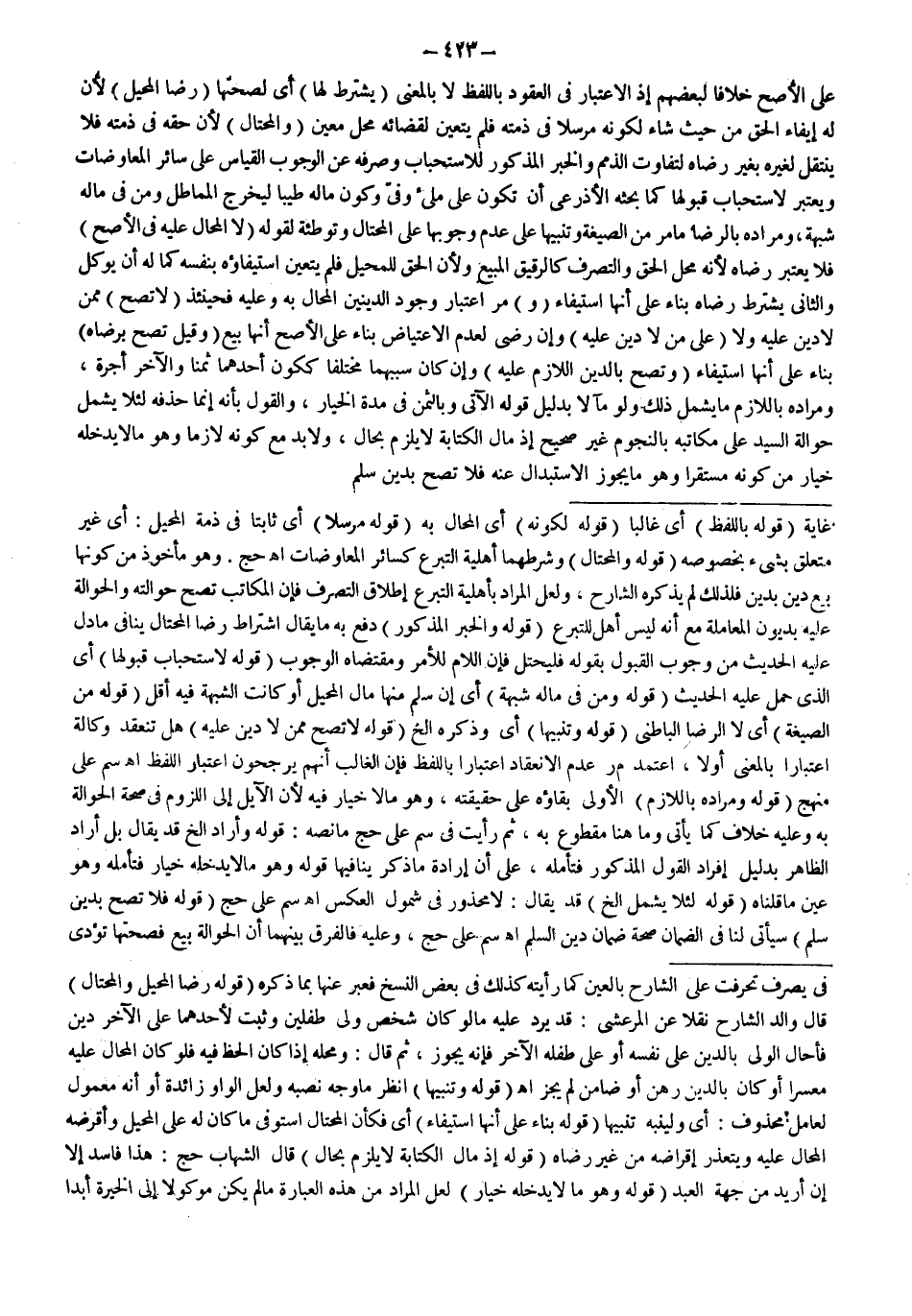 ـــــــــــــــــــــــــــــQفِي يَصْرِفُ تَحَرَّفَتْ عَلَى الشَّارِحِ بِالْعَيْنِ كَمَا رَأَيْتُهُ كَذَلِكَ فِي بَعْضِ النُّسَخِ فَعَبَّرَ عَنْهَا بِمَا ذَكَرَهُ. (قَوْلُهُ: رِضَا الْمُحِيلِ وَالْمُحْتَالِ) قَالَ وَالِدُ الشَّارِحِ نَقْلًا عَنْ الْمَرْعَشِيِّ: قَدْ يَرِدُ عَلَيْهِ مَا لَوْ كَانَ شَخْصٌ وَلِيُّ طِفْلَيْنِ وَثَبَتَ لِأَحَدِهِمَا عَلَى الْآخَرِ دَيْنٌ فَأَحَالَ الْوَلِيَّ بِالدَّيْنِ عَلَى نَفْسِهِ أَوْ عَلَى طِفْلِهِ الْآخَرِ فَإِنَّهُ يَجُوزُ، ثُمَّ قَالَ: وَمَحَلُّهُ إذَا كَانَ الْحَظُّ فِيهِ فَلَوْ كَانَ الْمُحَالُ عَلَيْهِ مُعْسِرًا أَوْ كَانَ بِالدَّيْنِ رَهْنٌ أَوْ ضَامِنٌ لَمْ يَجُزْ اهـ. (قَوْلُهُ: وَتَنْبِيهًا) اُنْظُرْ مَا وَجْهُ نَصْبِهِ وَلَعَلَّ الْوَاوَ زَائِدَةٌ أَوْ أَنَّهُ مَعْمُولٌ لِعَامِلٍ مَحْذُوفٍ: أَيْ وَلِيُنَبِّهَ تَنْبِيهًا. (قَوْلُهُ: بِنَاءً عَلَى أَنَّهَا اسْتِيفَاءٌ) أَيْ فَكَأَنَّ الْمُحْتَالَ اسْتَوْفَى مَا كَانَ لَهُ عَلَى الْمُحِيلِ وَأَقْرَضَهُ الْمُحَالُ عَلَيْهِ وَيَتَعَذَّرُ إقْرَاضُهُ مِنْ غَيْرِ رِضَاهُ