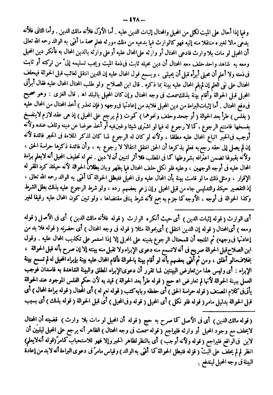 وَقَوْلُ ابْنِ الصَّلَاحِ قَبِلَ الْحَوَالَةَ صَرِيحٌ فِي أَنَّهُ لَا تُسْمَعُ مِنْهُ دَعْوَى الْإِبْرَاءِ، وَلَا تُقْبَلُ مِنْهُ بَيِّنَتُهُ إلَّا إنْ صَرَّحَ بِأَنَّهُ قَبِلَ الْحَوَالَةَ، بِخِلَافِ مَا لَوْ أَطْلَقَ، وَمِنْ ثَمَّ أَفْتَى بَعْضُهُمْ بِأَنَّهُ لَوْ أَقَامَ بَيِّنَةً بِالْحَوَالَةِ فَأَقَامَ الْمُحَالُ عَلَيْهِ بَيِّنَةً بِإِبْرَاءِ الْمُحِيلِ لَهُ لَمْ تُسْمَعْ بَيِّنَةُ الْإِبْرَاءِ: أَيْ وَلَيْسَ هَذَا مِنْ تَعَارُضِ الْبَيِّنَتَيْنِ لِمَا تَقَرَّرَ أَنَّ دَعْوَى الْإِبْرَاءِ الْمُطْلَقِ وَالْبَيِّنَةَ الشَّاهِدَةَ بِهِ فَاسِدَانِ فَوَجَبَ الْعَمَلُ بِبَيِّنَةِ الْحَوَالَةِ لِأَنَّهَا لَمْ تُعَارَضْ اهـ حَجّ