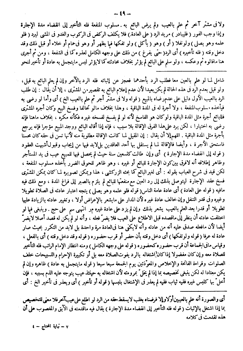 اللَّهُمَّ إلَّا أَنْ يُقَالَ: إنَّ الْمُقِيلَ لَمَّا كَانَتْ الْإِقَالَةُ مَطْلُوبَةً لِأَنَّهَا تُسَنُّ فِي حَقِّهِ كَانَ مُحْسِنًا فَاسْتَحَقَّ الْأُجْرَةَ، وَأَيْضًا فَالْإِقَالَةُ لَمَّا لَمْ يَسْتَقِلَّ بِهَا أَحَدُ الْعَاقِدَيْنِ بَلْ لَا بُدَّ فِيهَا مِنْ إيجَابٍ وَقَبُولٍ أَشْبَهَتْ الْعُقُودَ (قَوْلُهُ: إلَى انْقِضَاءِ مُدَّةِ الْإِجَارَةِ) أَيْ وَإِنْ طَالَتْ كَتِسْعِينَ سَنَةً حَيْثُ لَمْ يَحْصُلْ فِيهَا لِلْمَبِيعِ عَيْبٌ فِي يَدِ الْمُسْتَأْجِرِ وَظَاهِرُ إطْلَاقِهِ أَنَّهُ لَا فَرْقَ بَيْنَ كَوْنِ الْإِجَارَةِ لِلْبَائِعِ أَوْ غَيْرِهِ، وَهُوَ ظَاهِرٌ لِلُحُوقِ الضَّرَرِ بِأَخْذِهِ مَسْلُوبَ الْمَنْفَعَةِ، لَكِنْ قَيَّدَ فِي شَرْحِ الْعُبَابِ بِقَوْلِهِ: أَيْ لِغَيْرِ الْبَائِعِ كَمَا بَحَثَهُ الزَّرْكَشِيُّ، هَذَا وَيُمْكِنُ تَصْوِيرُهُ لَمَّا كَانَ يُمْكِنُ الْمُشْتَرِيَ فَسْخُ عَقْدِ الْإِجَارَةِ لِيَتَوَصَّلَ بِذَلِكَ إلَى رَدِّ الْعَيْنِ مَعَ مَنْفَعَتِهَا لِلْبَائِعِ لَمْ يَلْزَمْ بِالصَّبْرِ إلَى فَرَاغِ الْمُدَّةِ، وَمَعَ ذَلِكَ فِيهِ مَا فِيهِ (قَوْلُهُ: عَلَى الْعَادَةِ) أَيْ عَادَةِ عَامَّةِ النَّاسِ (قَوْلُهُ: فَلَوْ عَلِمَهُ وَهُوَ يُصَلِّي) يَتَّجِهُ اعْتِبَارُ عَادَتِهِ فِي الصَّلَاةِ تَطْوِيلًا وَغَيْرَهُ وَفِي قَدْرِ التَّنَفُّلِ وَإِنْ خَالَفَ عَادَةَ غَيْرِهِ لِأَنَّ الْمَدَارَ عَلَى مَا يُشْعِرُ بِالْإِعْرَاضِ أَوْ لَا، وَتَغْيِيرُ عَادَتِهِ بِالزِّيَادَةِ عَلَيْهَا تَطْوِيلًا أَوْ قَدْرًا بَعْدَ الْعِلْمِ بِالْعَيْبِ يُشْعِرُ بِذَلِكَ وَإِنْ لَمْ يَزِدْ عَلَى عَادَةِ غَيْرِهِ مَرَّ انْتَهَى سم عَلَى حَجّ.