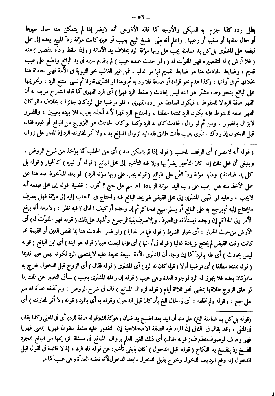 (وَإِذَا) (سَقَطَ رَدُّهُ بِتَقْصِيرٍ) مِنْهُ (فَلَا أَرْشَ) لَهُ لِتَقْصِيرِهِ فَهُوَ الْمُفَوِّتُ لَهُ (وَلَوْ حَدَثَ عِنْدَهُ عَيْبٌ) لَمْ يَتَقَدَّمْ سَبَبُهُ فِي يَدِ الْبَائِعِ وَأَطْلُع عَلَى عَيْبٍ قَدِيمٍ، وَضَابِطُ الْحَادِثِ هُنَا هُوَ ضَابِطُ الْقَدِيمِ فِيمَا مَرَّ غَالِبًا، فَمِنْ غَيْرِ الْغَالِبِ نَحْوُ الثُّيُوبَةِ فِي الْأَمَةِ فَهِيَ حَادِثَةٌ هُنَا بِخِلَافِهَا ثُمَّ فِي أَوَانِهَا، وَكَذَا عَدَمُ نَحْوِ قِرَاءَةٍ أَوْ صَنْعَةٍ فَلَا رَدَّ بِهِ ثَمَّ وَهُنَا لَوْ اشْتَرَى قَارِئًا ثُمَّ نَسِيَ امْتَنَعَ الرَّدُّ، وَتَحْرِيمُهَا عَلَى الْبَائِعِ بِنَحْوِ وَطْءِ مُشْتَرٍ هُوَ ابْنُهُ لَيْسَ بِحَادِثٍ (سَقَطَ الرَّدُّ قَهْرًا) أَيْ الرَّدُّ الْقَهْرِيُّ كَمَا قَالَهُ الشَّارِحُ مَرِيدًا بِهِ أَنَّ الْقَهْرَ صِفَةٌ لِلرَّدِّ لَا لِلسُّقُوطِ، فَيَكُونُ السَّاقِطُ هُوَ رَدُّهُ الْقَهْرِيُّ، فَلَوْ تَرَاضَيَا عَلَى الرَّدِّ كَانَ جَائِزًا، بِخِلَافِ مَا لَوْ كَانَ الْقَهْرُ صِفَةً لِلسُّقُوطِ فَإِنَّهُ يَكُونُ الرَّدُّ مُمْتَنِعًا مُطْلَقًا، وَامْتِنَاعُ الرَّدِّ قَهْرًا لِأَنَّهُ أَخَذَهُ بِعَيْبٍ فَلَا يَرُدُّهُ بِعَيْبَيْنِ، وَالضَّرَرُ لَا يُزَالُ بِالضَّرَرِ، وَمِنْ ثَمَّ لَوْ زَالَ الْحَادِثُ كَانَ لَهُ الرَّدُّ وَكَذَا لَوْ كَانَ الْحَادِثُ هُوَ التَّزْوِيجُ مِنْ الْبَائِعِ أَوْ غَيْرِهِ فَقَالَ قَبْلَ الدُّخُولِ إنْ رَدَّك الْمُشْتَرِي بِعَيْبٍ فَأَنْتِ طَالِقٌ فَلَهُ الرَّدُّ لِزَوَالِ الْمَانِعِ بِهِ، وَلَا أَثَرَ لِمُقَارَنَتِهِ لِلرَّدِّ إذْ الْمَدَارُ عَلَى زَوَالِ