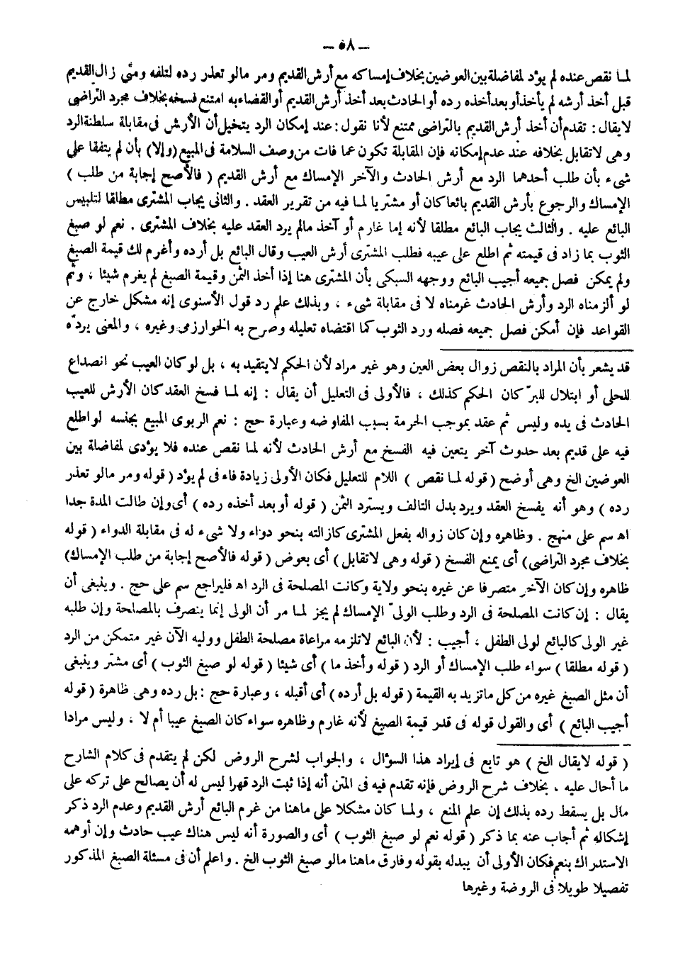 ـــــــــــــــــــــــــــــSقَدْ يُشْعِرُ بِأَنَّ الْمُرَادَ بِالنَّقْصِ زَوَالُ بَعْضِ الْعَيْنِ وَهُوَ غَيْرُ مُرَادٍ لِأَنَّ الْحُكْمَ لَا يُقَيَّدُ بِهِ، بَلْ لَوْ كَانَ الْعَيْبُ نَحْوُ انْصِدَاعٍ لِلْحُلِيِّ أَوْ ابْتِلَالٍ لِلْبُرِّ كَانَ الْحُكْمُ كَذَلِكَ، فَالْأَوْلَى فِي التَّعْلِيلِ أَنْ يُقَالَ: إنَّهُ لَمَّا فُسِخَ الْعَقْدُ كَانَ الْأَرْشُ لِلْعَيْبِ الْحَادِثِ فِي يَدِهِ وَلَيْسَ ثَمَّ عَقْدٌ بِمُوجِبِ الْحُرْمَةِ بِسَبَبِ الْمُفَاوَضَةِ وَعِبَارَةُ حَجّ: نَعَمْ الرِّبَوِيُّ الْمَبِيعُ بِجِنْسِهِ لَوْ اطَّلَعَ فِيهِ عَلَى قَدِيمٍ بَعْدَ حُدُوثِ آخَرَ يَتَعَيَّنُ فِيهِ الْفَسْخُ مَعَ أَرْشِ الْحَادِثِ لِأَنَّهُ لَمَّا نَقَصَ عِنْدَهُ فَلَا يُؤَدِّي لِمُفَاضَلَةٍ بَيْنَ الْعِوَضَيْنِ إلَخْ وَهِيَ أَوْضَحُ (قَوْلُهُ لَمَّا نَقَصَ) اللَّامُ لِلتَّعْلِيلِ فَكَانَ الْأَوْلَى زِيَادَةَ فَاءٍ فِي لَمْ يُؤَدِّ (قَوْلُهُ: وَمَرَّ مَا لَوْ تَعَذَّرَ رَدُّهُ) وَهُوَ أَنَّهُ يَفْسَخُ الْعَقْدَ وَيَرُدُّ بَدَلَ التَّالِفِ وَيَسْتَرِدُّ الثَّمَنَ (قَوْلُهُ: أَوْ بَعْدَ أَخْذِهِ رَدَّهُ) أَيْ وَإِنْ طَالَتْ الْمُدَّةُ جِدًّا اهـ سم عَلَى مَنْهَجٍ.