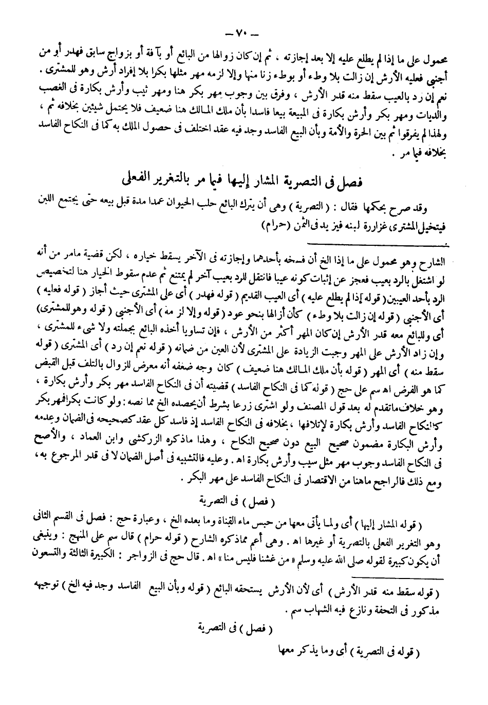 (فَصْلٌ) فِي التَّصْرِيَةِ (قَوْلُهُ: الْمُشَارُ إلَيْهَا) أَيْ وَلِمَا يَأْتِي مَعَهَا مِنْ حَبْسِ مَاءِ الْقَنَاةِ وَمَا بَعْدَهُ إلَخْ، وَعِبَارَةُ حَجّ: فَصْلٌ فِي الْقِسْمِ الثَّانِي وَهُوَ التَّغْرِيرُ الْفِعْلِيُّ بِالتَّصْرِيَةِ أَوْ غَيْرِهَا اهـ.