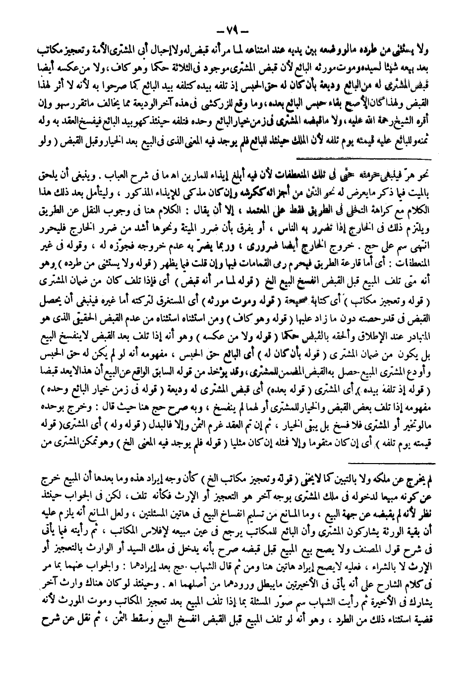 وَحِينَئِذٍ لَوْ كَانَ هُنَاكَ وَارِثٌ آخَرُ يُشَارِكُ فِي الْأَخِيرَةِ ثُمَّ رَأَيْتُ الشِّهَابَ سم صَوَّرَ الْمَسْأَلَةَ بِمَا إذَا تَلِفَ الْمَبِيعُ بَعْدَ تَعْجِيزِ الْمُكَاتَبِ وَمَوْتِ الْمُورَثِ؛ لِأَنَّهُ قَضِيَّةُ اسْتِثْنَاءِ ذَلِكَ مِنْ الطَّرْدِ، وَهُوَ أَنَّهُ لَوْ تَلِفَ الْمَبِيعُ قَبْلَ الْقَبْضِ انْفَسَخَ الْبَيْعُ وَسَقَطَ الثَّمَنُ، ثُمَّ نُقِلَ عَنْ شَرْحِ الْإِرْشَادِ