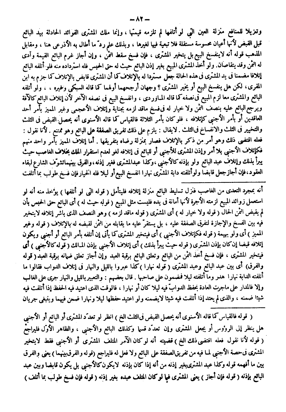 وَتَنْزِيلًا لِلْمَنَافِعِ مَنْزِلَةَ الْعَيْنِ الَّتِي لَوْ أَتْلَفَهَا لَمْ تَلْزَمْهُ قِيمَتُهَا، وَإِنَّمَا مَلَكَ الْمُشْتَرِي الْفَوَائِدَ الْحَادِثَةَ بِيَدِ الْبَائِعِ قَبْلَ الْقَبْضِ لِأَنَّهَا أَعْيَانُ مَحْسُوسَةٌ مُسْتَقِلَّةٌ فَلَا تَبَعِيَّةَ فِيهَا لِغَيْرِهَا، وَبِذَلِكَ عُلِمَ رَدُّ مَا أَطَالَ بِهِ الْأَذْرَعِيُّ هُنَا، وَمُقَابِلُ الْمَذْهَبِ قَوْلُهُ أَنَّهُ لَا يَنْفَسِخُ الْبَيْعُ بَلْ يَتَخَيَّرُ الْمُشْتَرِي، فَإِنْ فَسَخَ سَقَطَ الثَّمَنُ، وَإِنْ أَجَازَ غَرَّمَ الْبَائِعَ الْقِيمَةَ وَأَدَّى لَهُ الثَّمَنَ وَقَدْ يَتَقَاصَّانِ.