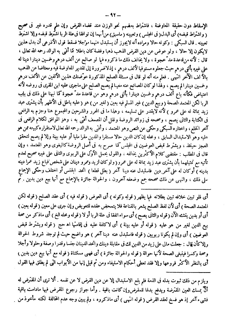 قَالَ السُّبْكِيُّ: وَكَوْنُهُ حَالًّا وَمُرَادُهُ أَنَّهُ لَا يَجُوزُ أَنْ يُسْتَبْدَلَ عَنْهُمَا مُؤَجَّلًا فَسَقَطَ قَوْلُ الْأَذْرَعِيِّ أَنَّ بَدَلَ هَذَيْنِ لَا يَكُونُ إلَّا حَالًّا، وَلَوْ عِوَضٌ عَنْ دَيْنِ الْقَرْضِ الذَّهَبُ ذَهَبًا وَفِضَّةً كَانَ بَاطِلًا كَمَا أَفْتَى بِهِ الْوَالِدُ - رَحِمَهُ اللَّهُ تَعَالَى -، قَالَ: لِأَنَّهُ مِنْ قَاعِدَةِ مَدِّ عَجْوَةٍ، وَلَا يُخَالِفُ ذَلِكَ مَا ذَكَرُوهُ فِيمَا لَوْ صَالَحَ عَنْ أَلْفِ دِرْهَمٍ وَخَمْسِينَ دِينَارًا دَيْنًا لَهُ عَلَى غَيْرِهِ بِأَلْفَيْ دِرْهَمٍ حَيْثُ جَعَلُوهُ مُسْتَوْفِيًا لِأَلْفِ دِرْهَمٍ، إذْ لَا ضَرُورَةَ إلَى تَقْدِيرِ الْمُعَاوَضَةِ فِيهِ وَمُعْتَاضًا عَنْ الذَّهَبِ بِالْأَلْفِ الْآخَرِ انْتَهَى.