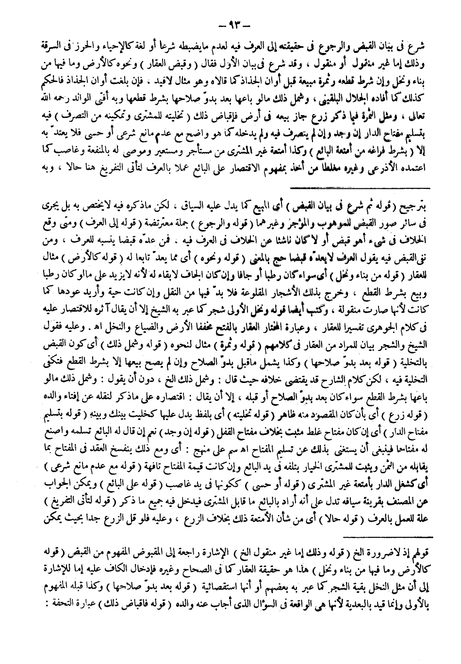(قَوْلُهُ: ثُمَّ شَرَعَ فِي بَيَانِ الْقَبْضِ) أَيْ الْمَبِيعِ كَمَا يَدُلُّ عَلَيْهِ السِّيَاقُ، لَكِنَّ مَا ذَكَرَهُ فِيهِ لَا يَخْتَصُّ بِهِ بَلْ يَجْرِي فِي سَائِرِ صُوَرِ الْقَبْضِ لِلْمَوْهُوبِ وَالْمُؤَجَّرِ وَغَيْرِهِمَا (قَوْلُهُ: وَالرُّجُوعُ) جُمْلَةٌ مُعْتَرِضَةٌ (قَوْلُهُ: إلَى الْعُرْفِ) وَمَتَى وَقَعَ الْخِلَافُ فِي شَيْءٍ أَهْوَ قَبْضٌ أَوْ لَا كَانَ نَاشِئًا عَنْ الْخِلَافِ فِي الْعُرْفِ فِيهِ، فَمَنْ عَدَّهُ قَبْضًا يَنْسُبُهُ لِلْعُرْفِ، وَمَنْ نَفَى الْقَبْضَ فِيهِ يَقُولُ الْعُرْفُ لَا يَعُدُّهُ قَبْضًا حَجّ بِالْمَعْنَى (قَوْلُهُ: وَنَحْوُهُ) أَيْ مِمَّا يُعَدُّ تَابِعًا لَهُ (قَوْلُهُ: كَالْأَرْضِ) مِثَالٌ لِلْعَقَارِ (قَوْلُهُ مِنْ بِنَاءٍ وَنَخْلٍ) أَيْ سَوَاءٌ كَانَ رَطْبًا أَوْ جَافًّا وَإِنْ كَانَ الْجَافُّ لَا بَقَاءَ لَهُ لِأَنَّهُ لَا يَزِيدُ عَلَى مَا لَوْ كَانَ رَطْبًا وَبَيْعٌ بِشَرْطِ الْقَطْعِ، وَخَرَجَ بِذَلِكَ الْأَشْجَارُ الْمَقْلُوعَةُ فَلَا بُدَّ فِيهَا مِنْ النَّقْلِ وَإِنْ كَانَتْ حَيَّةً وَأُرِيدَ عَوْدُهَا كَمَا كَانَتْ لِأَنَّهَا صَارَتْ مَنْقُولَةً، وَكَتَبَ أَيْضًا قَوْلَهُ وَنَخْلُ الْأُولَى شَجَرٌ كَمَا عَبَّرَ بِهِ الشَّيْخُ إلَّا أَنْ يُقَالَ آثَرَهُ لِلِاقْتِصَارِ عَلَيْهِ فِي كَلَامِ الْجَوْهَرِيِّ تَفْسِيرًا لِلْعَقَارِ، وَعِبَارَةُ الْمُخْتَارِ الْعَقَارُ بِالْفَتْحِ مُخَفَّفًا الْأَرْضُ وَالضِّيَاعُ وَالنَّخْلُ اهـ.