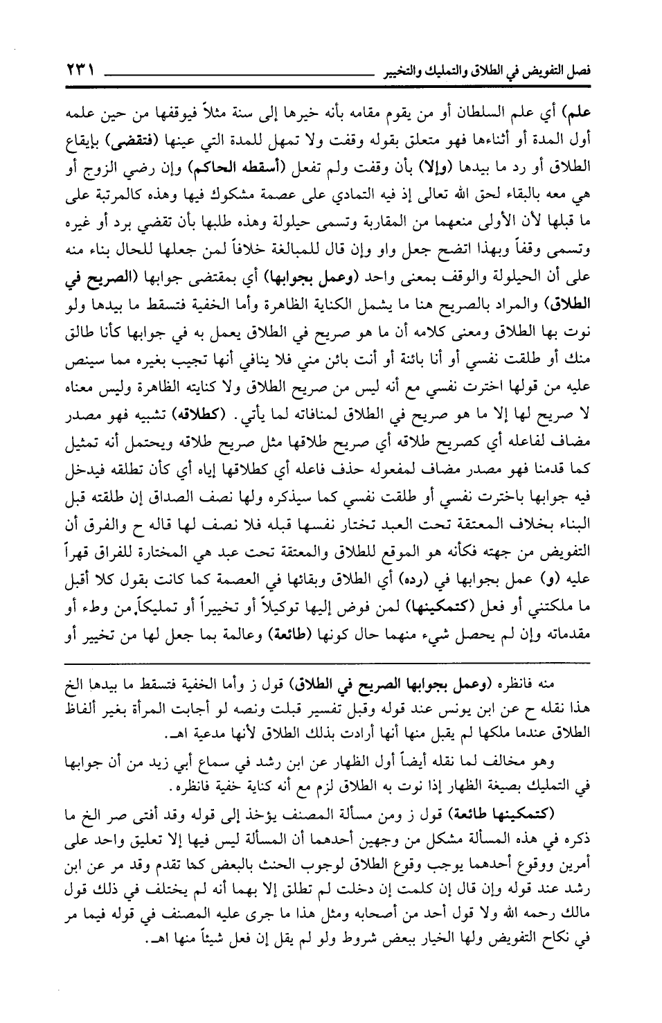 علم) أي علم السلطان أو من يقوم مقامه بأنه خيرها إلى سنة مثلًا فيوقفها من حين عليه أول المدة أو أثناءها فهو متعلق بقوله وقفت ولا تمهل للمدة التي عينها (فتقضى) بإيقاع الطلاق أو رد ما بيدها (وإلا) بأن وقفت ولم تفعل (أسقطه الحاكم) وإن رضي الزوج أو هي معه بالبقاء لحق الله تعالى إذ فيه التمادي على عصمة مشكوك فيها وهذه كالمرتبة على ما قبلها لأن الأولى منعهما من المقاربة وتسمى حيلولة وهذه طلبها بأن تقضي برد أو غيره وتسمى وقفًا وبهذا اتضح جعل واو وإن قال للمبالغة خلافًا لمن جعلها للحال بناء منه على أن الحيلولة والوقف بمعنى واحد (وعمل بجوابها) أي بمقتضى جوابها (الصريح في الطلاق) والمراد بالصريح هنا ما يشمل الكناية الظاهرة وأما الخفية فتسقط ما بيدها ولو نوت بها الطلاق ومعنى كلامه أن ما هو صريح في الطلاق يعمل به في جوابها كأنا طالق منك أو طلقت نفسي أو أنا بائنة أو أنت بائن مني فلا ينافي أنها تجيب بغيره مما سينص عليه من قولها اخترت نفسي مع أنه ليس من صريح الطلاق ولا كنايته الظاهرة وليس معناه لا صريح لها إلا ما هو صريح في الطلاق لمنافاته لما يأتي. (كطلاقه) تشبيه فهو مصدر مضاف لفاعله أي كصريح طلاقه أي صريح طلاقها مثل صريح طلاقه ويحتمل أنه تمثيل كما قدمنا فهو مصدر مضاف لمفعوله حذف فاعله أي كطلاقها إياه أي كأن تطلقه فيدخل فيه جوابها باخترت نفسي أو طلقت نفسي كما سيذكره ولها نصف الصداق إن طلقته قبل البناء بخلاف المعتقة تحت العبد تختار نفسها قبله فلا نصف لها قاله ح والفرق أن التفويض من جهته فكأنه هو الموقع للطلاق والمعتقة تحت عبد هي المختارة للفراق قهرًا عليه (و) عمل بجوابها في (رده) أي الطلاق وبقائها في العصمة كما كانت بقول كلا أقبل ما ملكتني أو فعل (كتمكينها) لمن فوض إليها توكيلًا أو تخييرًا أو تمليكًا من وطء أو مقدماته وإن لم يحصل شيء منهما حال كونها (طائعة) وعالمة بما جعل لها من تخيير أو
