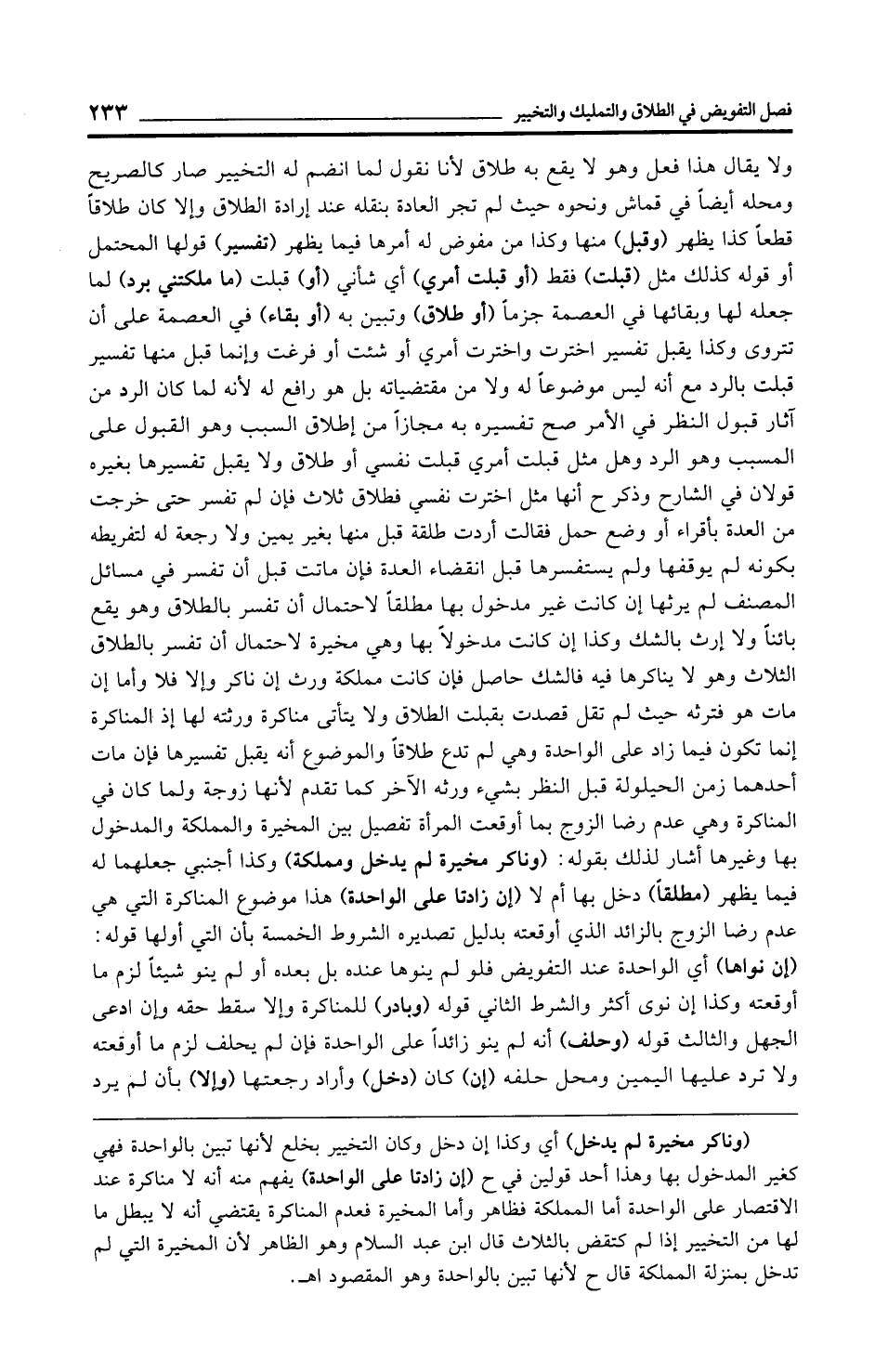 (وناكر مخيرة لم يدخل) أي وكذا إن دخل وكان التخيير بخلع لأنها تبين بالواحدة فهي كغير المدخول بها وهذا أحد قولين في ح (إن زادتا على الواحدة) يفهم منه أنه لا مناكرة عند الاقتصار على الواحدة أما المملكة فظاهر وأما المخيرة فعدم المناكرة يقتضي أنه لا يبطل ما لها من التخيير إذا لم كتقض بالثلاث قال ابن عبد السلام وهو الظاهر لأن المخيرة التي لم تدخل بمنزلة المملكة قال ح لأنها تبين بالواحدة وهو المقصود اهـ.