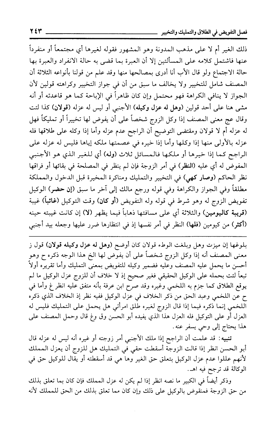 تنبيه: قد علمت أن الراجح إذا ملك الأجنبي أمر زوجته أو غيره أنه ليس له عزله قال أبو الحسن انظر إذا قالت الزوجة أسقطت حقي في التمليك هل للزوج أن يعزل المملك لأنهم عللوا عدم عزل الوكيل بتعلق حق الغير وها هي قد أسقطته أو يقال للوكيل حق في الوكالة قد ترجح فيه اهـ.