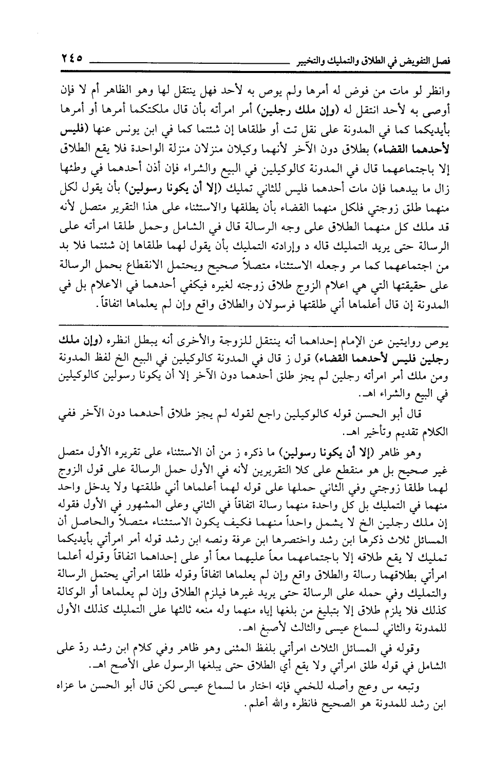 وهو ظاهر (إلا أن يكونا رسولين) ما ذكره ز من أن الاستثناء على تقريره الأول متصل غير صحيح بل هو منقطع على كلا التقريرين لأنه في الأول حمل الرسالة على قول الزوج لهما طلقا زوجتي وفي الثاني حملها على قوله لهما أعلماها أني طلقتها ولا يدخل واحد منهما في التمليك بل كل واحدة منهما رسالة اتفاقًا في الثاني وعلى المشهور في الأول فقوله إن ملك رجلين الخ لا يشمل واحدًا منهما فكيف يكون الاستثناء متصلًا والحاصل أن المسائل ثلاث ذكرها ابن رشد واختصرها ابن عرفة ونصه ابن رشد قوله أمر امرأتي بأيديكما تمليك لا يقع طلاقه إلا باجتماعهما معًا عليهما معًا أو على إحداهما اتفاقًا وقوله أعلما امرأتي بطلاقهما رسالة والطلاق واقع وإن لم يعلماها اتفاقًا وقوله طلقا امرأتي يحتمل الرسالة والتمليك وفي حمله على الرسالة حتى يريد غيرها فيلزم الطلاق وإن لم يعلماها أو الوكالة كذلك فلا يلزم طلاق إلا بتبليغ من بلغها إياه منهما وله منعه ثالثها على التمليك كذلك الأول للمدونة والثاني لسماع عيسى والثالث لأصبغ اهـ.