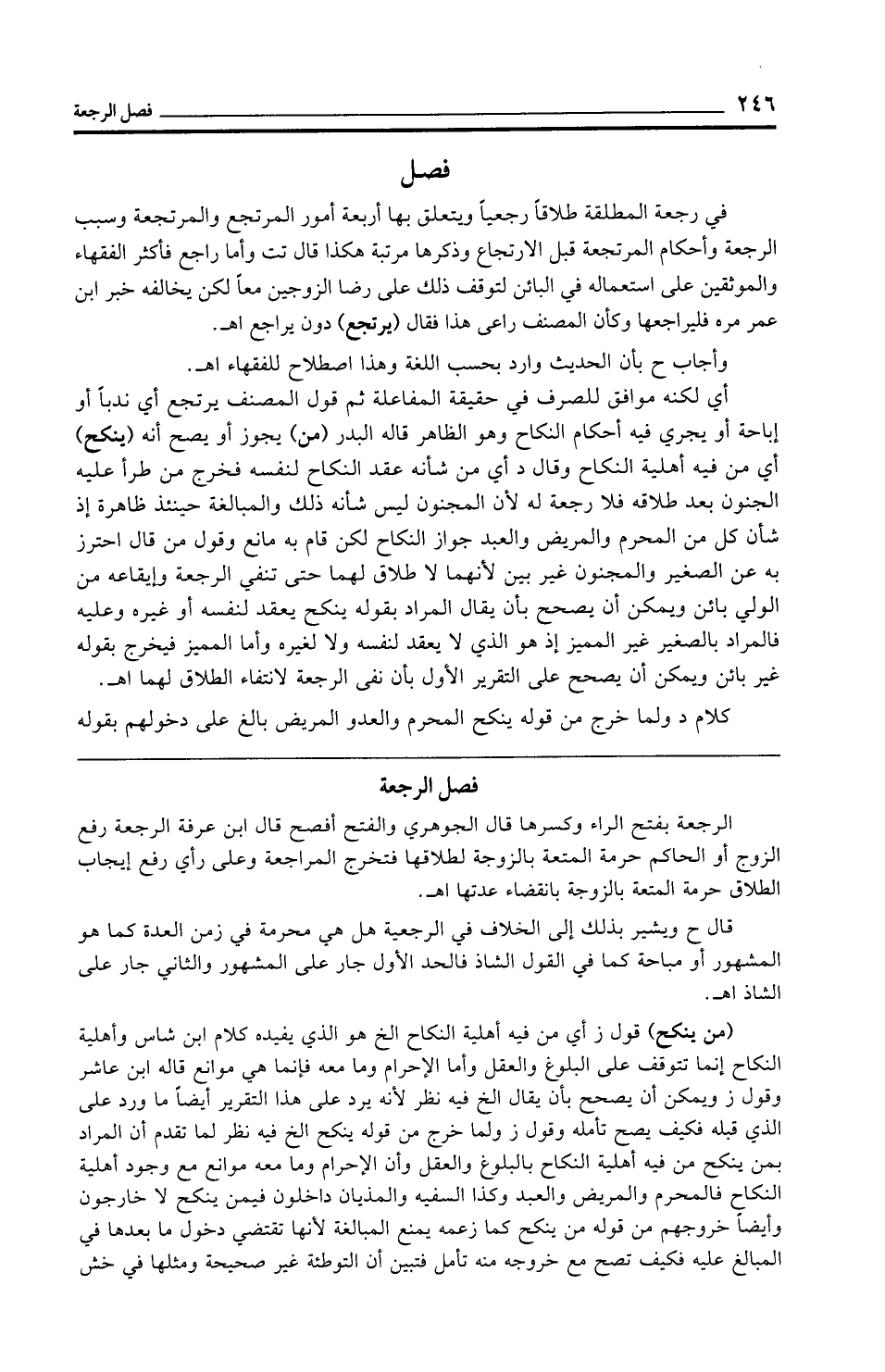 في رجعة المطلقة طلاقًا رجعيًّا ويتعلق بها أربعة أمور المرتجع والمرتجعة وسبب الرجعة وأحكام المرتجعة قبل الارتجاع وذكرها مرتبة هكذا قال تت وأما راجع فأكثر الفقهاء والموثقين على استعماله في البائن لتوقف ذلك على رضا الزوجين معًا لكن يخالفه خبر ابن عمر مره فليراجعها وكأن المصنف راعى هذا فقال (يرتجع) دون يراجع اهـ.