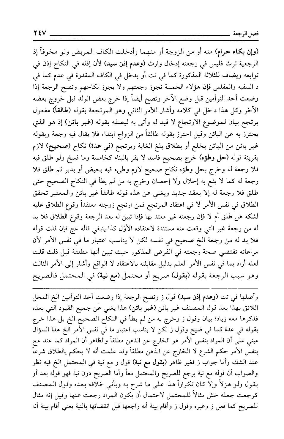 وأصلها في تت (وعدم إذن سيد) قول ز وتصح الرجعة إذا وضعت أحد التوأمين الخ المحل اللائق بهذا بعد قول المصنف غير بائن (غير بائن) هذا يغني عن جميع القيود التي بعده فذكرها معه زيادة بيان وقول ز وخرج به من لم يطأ في النكاح الصحيح الخ بل هذا خرج بقوله في عدة كما في ضيح وقول ز لكن لا يناسب اعتبار ما في نفس الأمر الخ هذا السؤال مبني على أن المراد بنفس الأمر هو الخارج عن الذهن مطلقًا والظاهر أن المراد كما عند عج بنفس الأمر حكم الشرع لا الخارج عن الذهن مطلقًا وقد علمت أنه لا يحكم بالطلاق شرعًا عند الشك وأما جواب ز فغير ظاهر (يقول مع نية) قول ز مع نية في المحتمل الخ فيه نظر والصواب أن قوله مع نية يرجع للصريح والمحتمل معًا وأما الصريح دون نية فهو قوله بعد أو يقول ولو هزلًا وإلا كان تكرارًا هذا على ما شرح به ويأتي خلافه بعده وقول المصنف كرجعت جعله خش مثالًا للمحتمل لاحتمال أن يكون المراد رجعت عنها وقيل إنه مثال للصريح كما فعل ز وغيره وقول ز وأقام بينة أنه راجعها قبل انقضائها بالنية يعني أقام بينة أنه