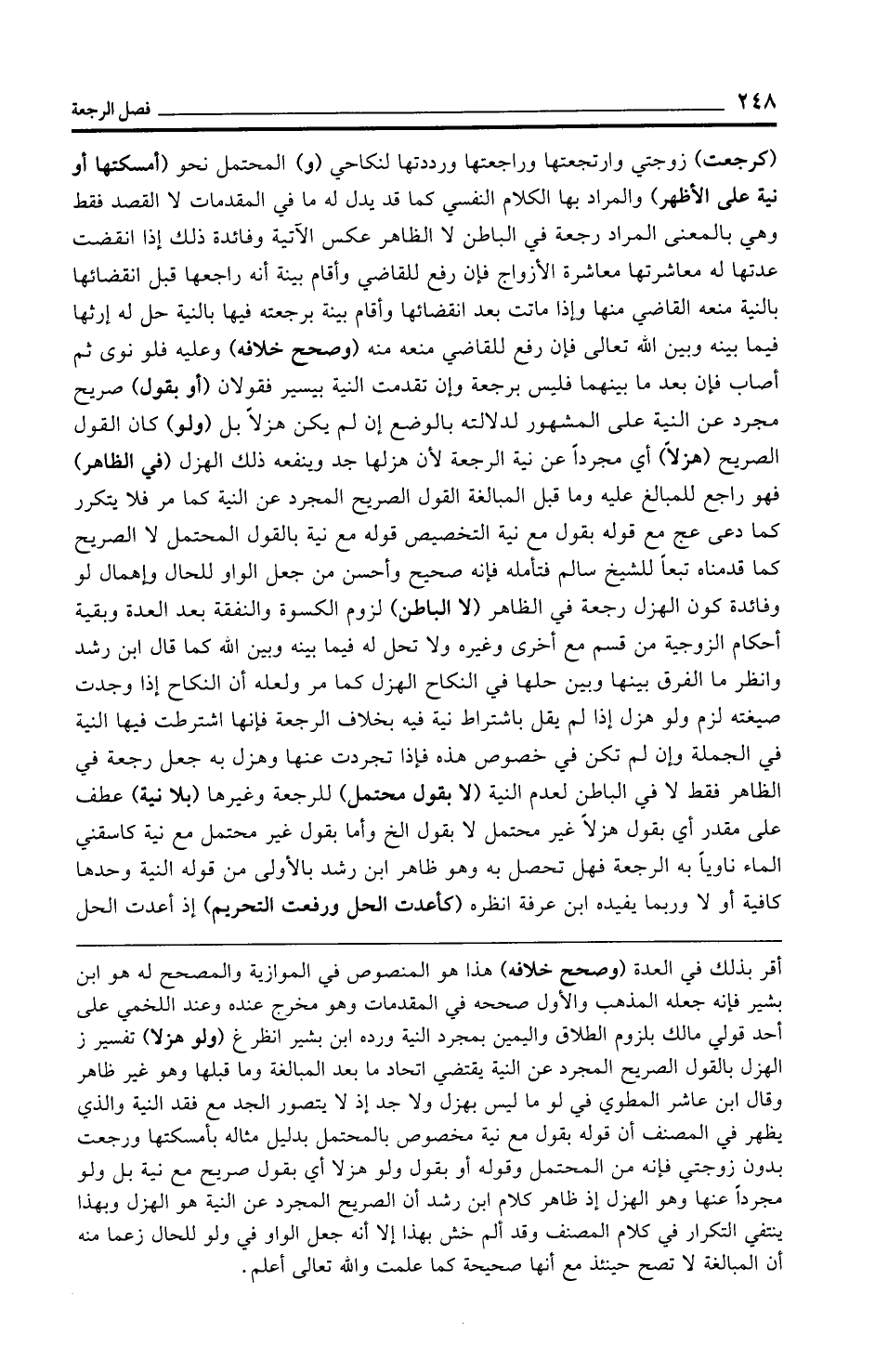 (كرجعت) زوجتي وارتجعتها وراجعتها ورددتها لنكاحي (و) المحتمل نحو (أمسكتها أو نية على الأظهر) والمراد بها الكلام النفسي كما قد يدل له ما في المقدمات لا القصد فقط وهي بالمعنى المراد رجعة في الباطن لا الظاهر عكس الآتية وفائدة ذلك إذا انقضت عدتها له معاشرتها معاشرة الأزواج فإن رفع للقاضي وأقام بينة أنه راجعها قبل انقضائها بالنية منعه القاضي منها وإذا ماتت بعد انقضائها وأقام بينة برجعته فيها بالنية حل له إرثها فيما بينه وبين الله تعالى فإن رفع للقاضي منعه منه (وصحح خلافه) وعليه فلو نوى ثم أصاب فإن بعد ما بينهما فليس برجعة وإن تقدمت النية بيسير فقولان (أو يقول) صريح مجرد عن النية على المشهور لدلالته بالوضع إن لم يكن هزلًا (ولو) كان القول الصريح (هزلًا) أي مجردًا عن نية الرجعة لأن هزلها جد وينفعه ذلك الهزل (في الظاهر) فهو راجع للمبالغ عليه وما قبل المبالغة القول الصريح المجرد عن النية كما مر فلا يتكرر كما دعى عج مع قوله بقول مع نية التخصيص قوله مع نية بالقول المحتمل لا الصريح كما قدمناه تبعًا للشيخ سالم فتأمله فإنه صحيح وأحسن من جعل الواو للحال وإهمال لو وفائدة كون الهزل رجعة في الظاهر (لا الباطن) لزوم الكسوة والنفقة بعد العدة وبقية أحكام الزوجية من قسم مع أخرى وغيره ولا تحل له فيما بينه وبين الله كما قال ابن رشد وانظر ما الفرق بينها وبين حلها في النكاح الهزل كما مر ولعله أن النكاح إذا وجدت صيغته لزم ولو هزل إذا لم يقل باشتراط نية فيه بخلاف الرجعة فإنها اشترطت فيها النية في الجملة وإن لم تكن في خصوص هذه فإذا تجردت عنها وهزل به جعل رجعة في الظاهر فقط لا في الباطن لعدم النية (لا يقول محتمل) للرجعة وغيرها (بلا نية) عطف على مقدر أي يقول هزلًا غير محتمل لا يقول الخ وأما يقول غير محتمل مع نية كاسقني الماء ناويًا به الرجعة فهل تحصل به وهو ظاهر ابن رشد بالأولى من قوله النية وحدها كافية أو لا وربما يفيده ابن عرفة انظره (كأعدت الحل ورفعت التحريم) إذ أعدت الحل