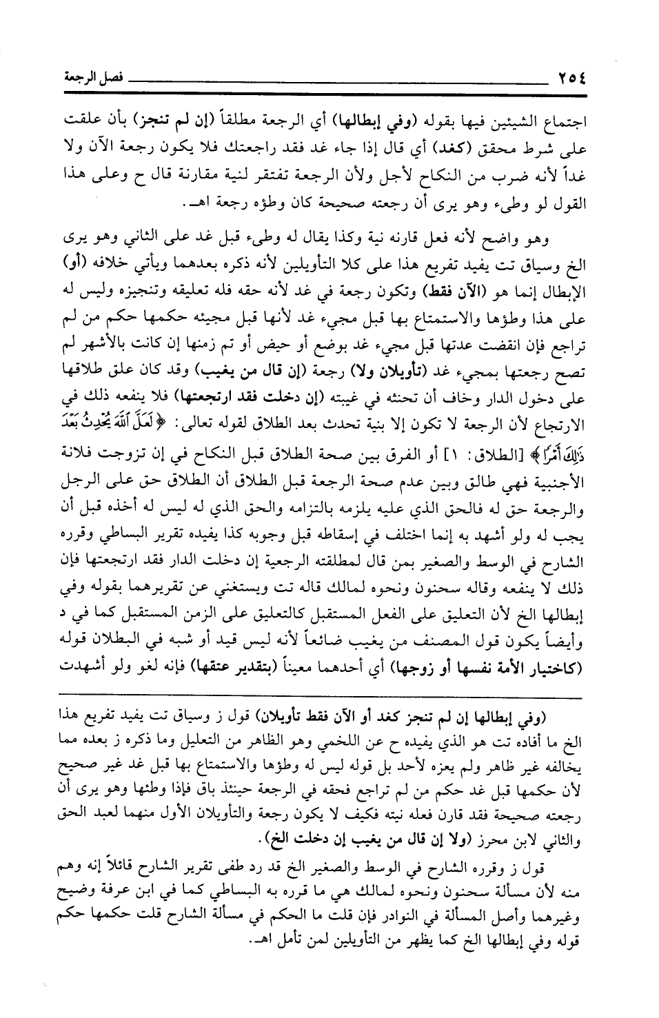 (وفي إبطالها إن لم تنجز كغد أو الآن فقط تأويلان) قول ز وسياق تت يفيد تفريع هذا الخ ما أفاده تت هو الذي يفيده ح عن اللخمي وهو الظاهر من التعليل وما ذكره ز بعده مما يخالفه غير ظاهر ولم يعزه لأحد بل قوله ليس له وطؤها والاستمتاع بها قبل غد غير صحيح لأن حكمها قبل غد حكم من لم تراجع فحقه في الرجعة حينئذ بأن فإذا وطئها وهو يرى أن رجعته صحيحة فقد قارن فعله نيته فكيف لا يكون رجعة والتأويلان الأول منهما لعبد الحق والثاني لابن محرز (ولا إن قال من يغيب إن دخلت الخ).