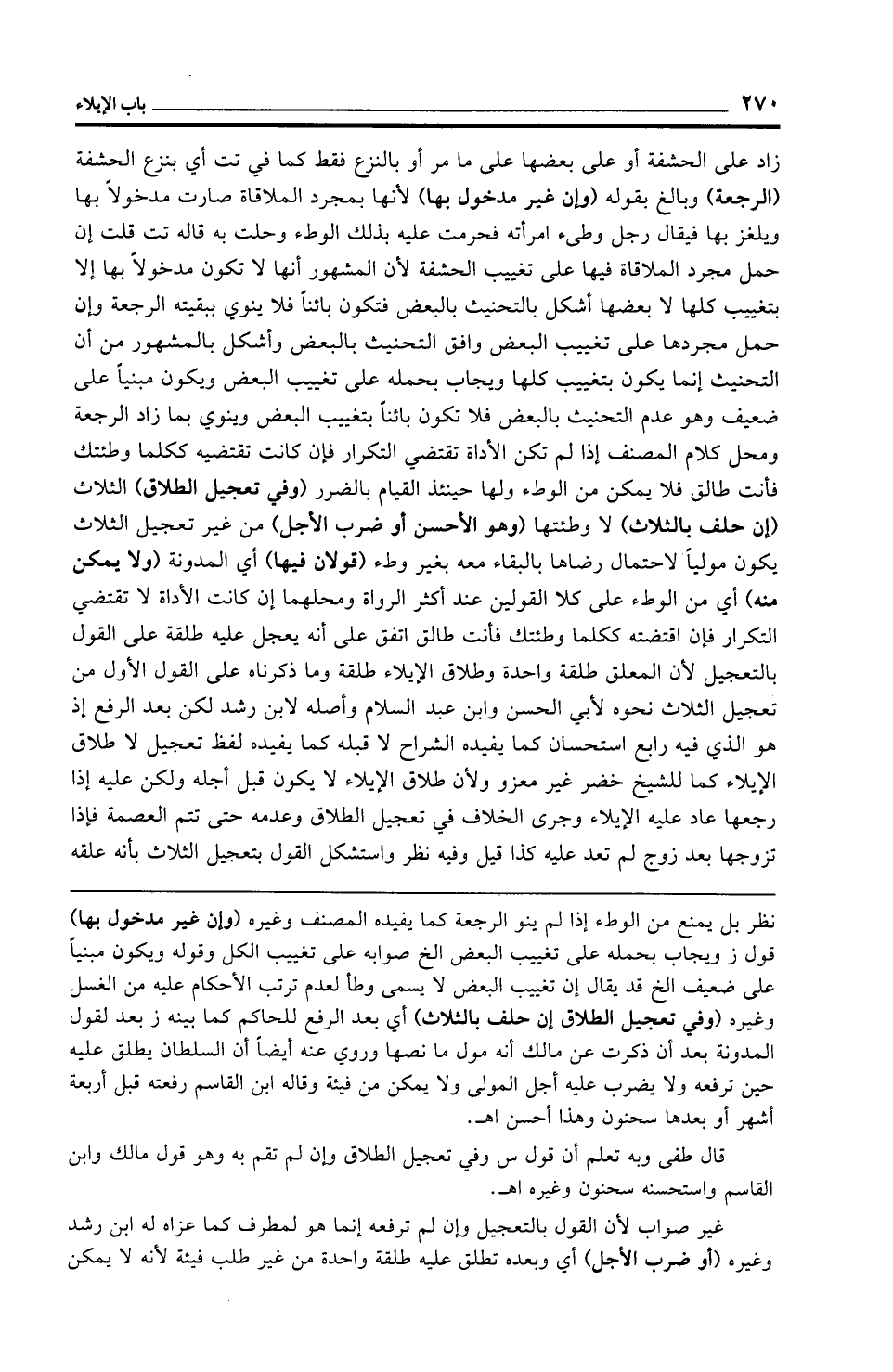 قال طفى وبه تعلم أن قول س وفي تعجيل الطلاق وإن لم تقم به وهو قول مالك وابن القاسم واستحسنه سحنون وغيره اهـ.