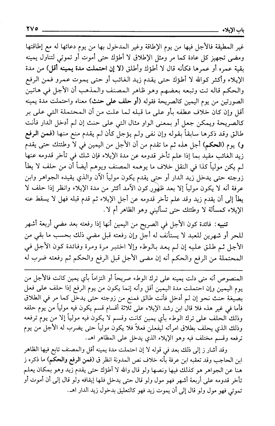 غير المطيقة فالأجل فيها من يوم الإطاقة وغير المدخول بها من يوم دعائها له مع إطاقتها ومضى تجهيز كل عادة كما مر ومثل الإطلاق لا أطؤك حتى أموت أو تموتي لتناول يمينه بقية عمره أو عمرها فكأنه قال لا أطؤك وأطلق (لا إن احتملت مدة يمينه أقل) من مدة الإيلاء وأكثر كوالله لا أطؤك حتى يقدم زيد الغائب أو حتى يموت عمرو فمن الرفع والحكم قاله تت وتبعه بعضهم وهو ظاهر المصنف والمذهب أن الأجل في هاتين الصورتين من يوم اليمين كالصريحة فقوله (أو حلف على حنث) معناه واحتملت مدة يمينه أقل وإن كان خلاف عطفه بأو على ما قبله لما علت من أن المحتملة التي على بر كالصريحة ويمكن جعل أو بمعنى الواو مثال التي على حنث إن لم أدخل الدار فأنت طالق وقد ذكرها سابقًا بقوله وإن نفى ولم يؤجل كأن لم يقدم منع منها (فمن الرفع و) يوم (الحكم) أجل هذه ثم ما تقدم من أن الأجل من اليمين في لا وطئتك حتى يقدم زيد الغائب مقيد بما إذا علم تأخر قدومه عن مدة الإيلاء فإن شك في تأخر قدومه عنها لم يكن موليًا كذا في النقل خلاف ما يوهمه المصنف ويوهم أيضًا أن من حلف لا يطأ زوجته حتى يدخل زيد الدار أو حتى يقدم يكون موليًا الآن والذي يقيده الجواهر وابن عرفة أنه لا يكون موليًا إلا بعد ظهور كون الآمد أكثر من مدة الإيلاء وانظر إذا حلف لا يطأ إلى أن يقدم زيد وقد علم تأخر قدومه عن أجل الإيلاء ثم قدم قبله فهل لا يسقط عنه الإيلاء كمسألة لا وطئتك حتى تسأليني وهو الظاهر أم لا.
