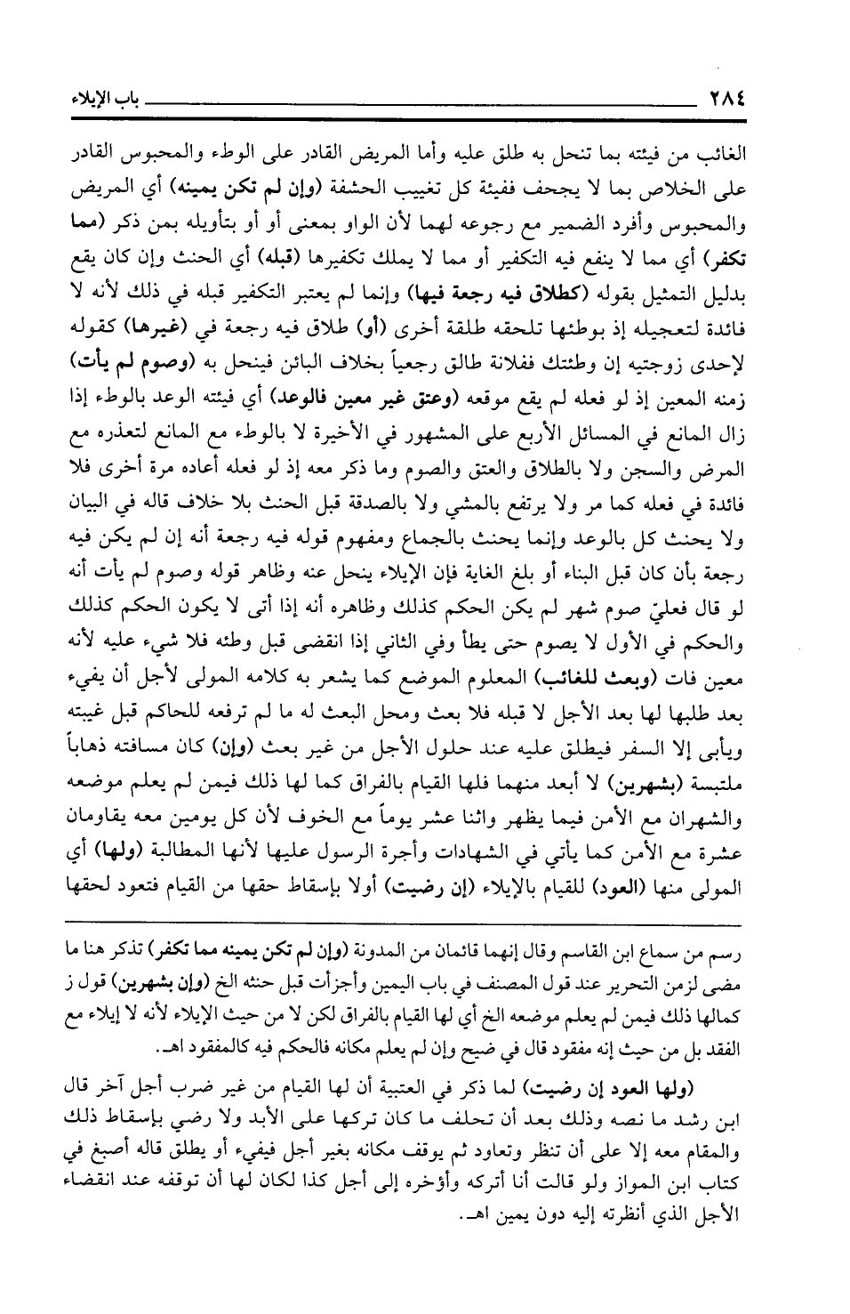 رسم من سماع ابن القاسم وقال إنهما قائمان من المدونة (وإن لم تكن يمينه مما تكفر) تذكر هنا ما مضى لزمن التحرير عند قول المصنف في باب اليمين وأجزأت قبل حنثه الخ (وإن بشهرين) قول ز كمالها ذلك فيمن لم يعلم موضعه الخ أي لها القيام بالفراق لكن لا من حيث الإيلاء لأنه لا إيلاء مع الفقد بل من حيث إنه مفقود قال في ضيح وإن لم يعلم مكانه فالحكم فيه كالمفقود اهـ.