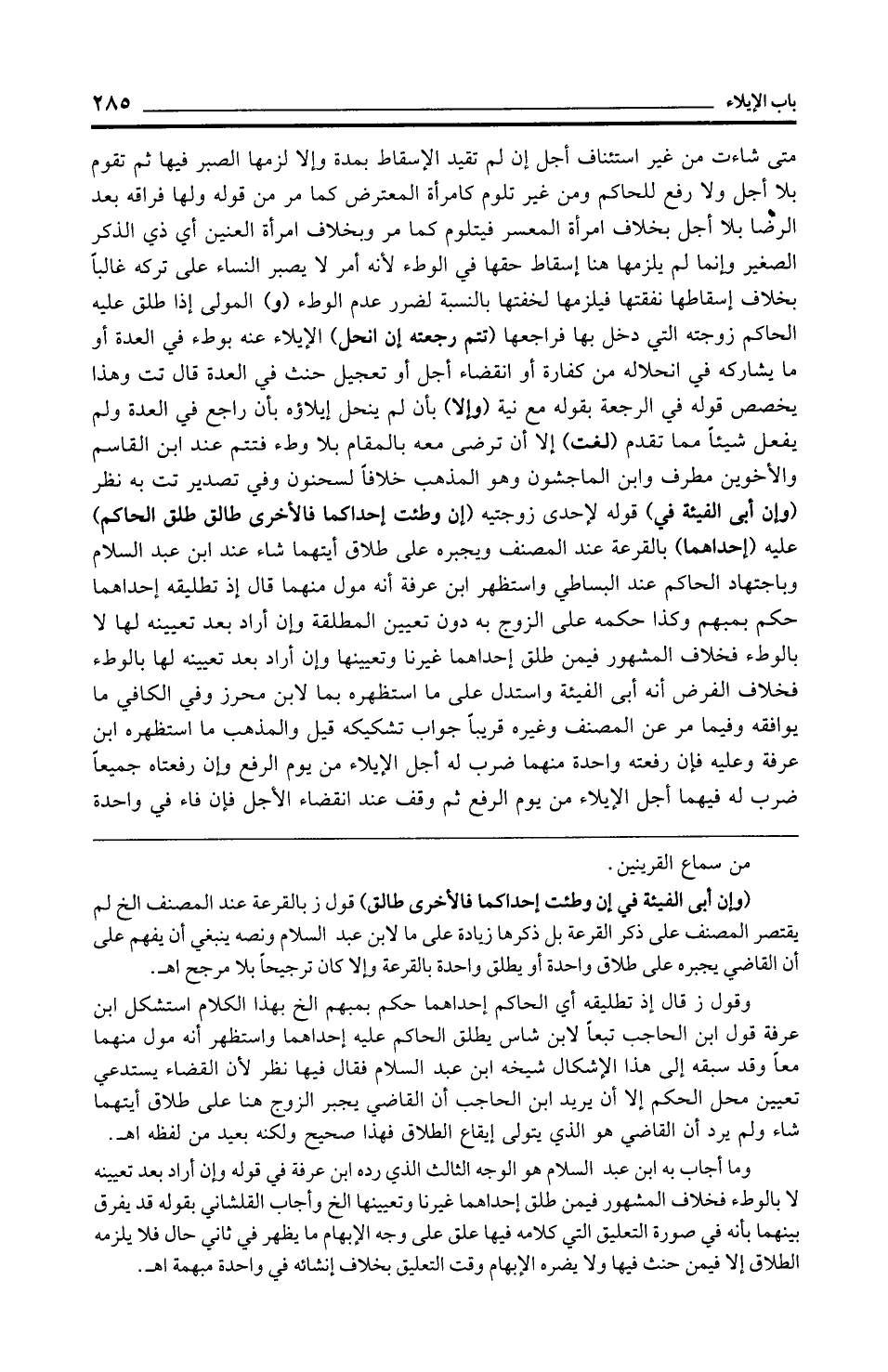 متى شاءت من غير استئناف أجل إن لم تقيد الإسقاط بمدة وإلا لزمها الصبر فيها ثم تقوم بلا أجل ولا رفع للحاكم ومن غير تلوم كامرأة المعترض كما مر من قوله ولها فراقه بعد الرضا بلا أجل بخلاف امرأة المعسر فيتلوم كما مر وبخلاف امرأة العنين أي ذي الذكر الصغير وإنما لم يلزمها هنا إسقاط حقها في الوطء لأنه أمر لا يصبر النساء على تركه غالبًا بخلاف إسقاطها نفقتها فيلزمها لخفتها بالنسبة لضرر عدم الوطء (و) المولى إذا طلق عليه الحاكم زوجته التي دخل بها فراجعها (تتم رجعته إن انحل) الإيلاء عنه بوطء في العدة أو ما يشاركه في انحلاله من كفارة أو انقضاء أجل أو تعجيل حنث في العدة قال تت وهذا يخصص قوله في الرجعة بقوله مع نية (وإلا) بأن لم ينحل إيلاؤه بأن راجع في العدة ولم يفعل شيئًا مما تقدم (لغت) إلا أن ترضى معه بالمقام بلا وطء فتتم عند ابن القاسم والأخوين مطرف وابن الماجشون وهو المذهب خلافًا لسحنون وفي تصدير تت به نظر (وإن أبى الفيئة في) قوله لإحدى زوجتيه (إن وطئت إحداكما فالأخرى طالق طلق الحاكم) عليه (إحداهما) بالقرعة عند المصنف ويجبره على طلاق أيتهما شاء عند ابن عبد السلام وباجتهاد الحاكم عند البساطي واستظهر ابن عرفة أنه مول منهما قال إذ تطليقه إحداهما حكم بمبهم وكذا حكمه على الزوج به دون تعيين المطلقة وإن أراد بعد تعيينه لها لا بالوطء فخلاف المشهور فيمن طلق إحداهما غيرنا وتعيينها وإن أراد بعد تعيينه لها بالوطء فخلاف الفرض أنه أبى الفيئة واستدل على ما استظهره بما لابن محرز وفي الكافي ما يوافقه وفيما مر عن المصنف وغيره قريبًا جواب تشكيكه قيل والمذهب ما استظهره ابن عرفة وعليه فإن رفعته واحدة منهما ضرب له أجل الإيلاء من يوم الرفع وإن رفعتاه جميعًا ضرب له فيهما أجل الإيلاء من يوم الرفع ثم وقف عند انقضاء الأجل فإن فاء في واحدة