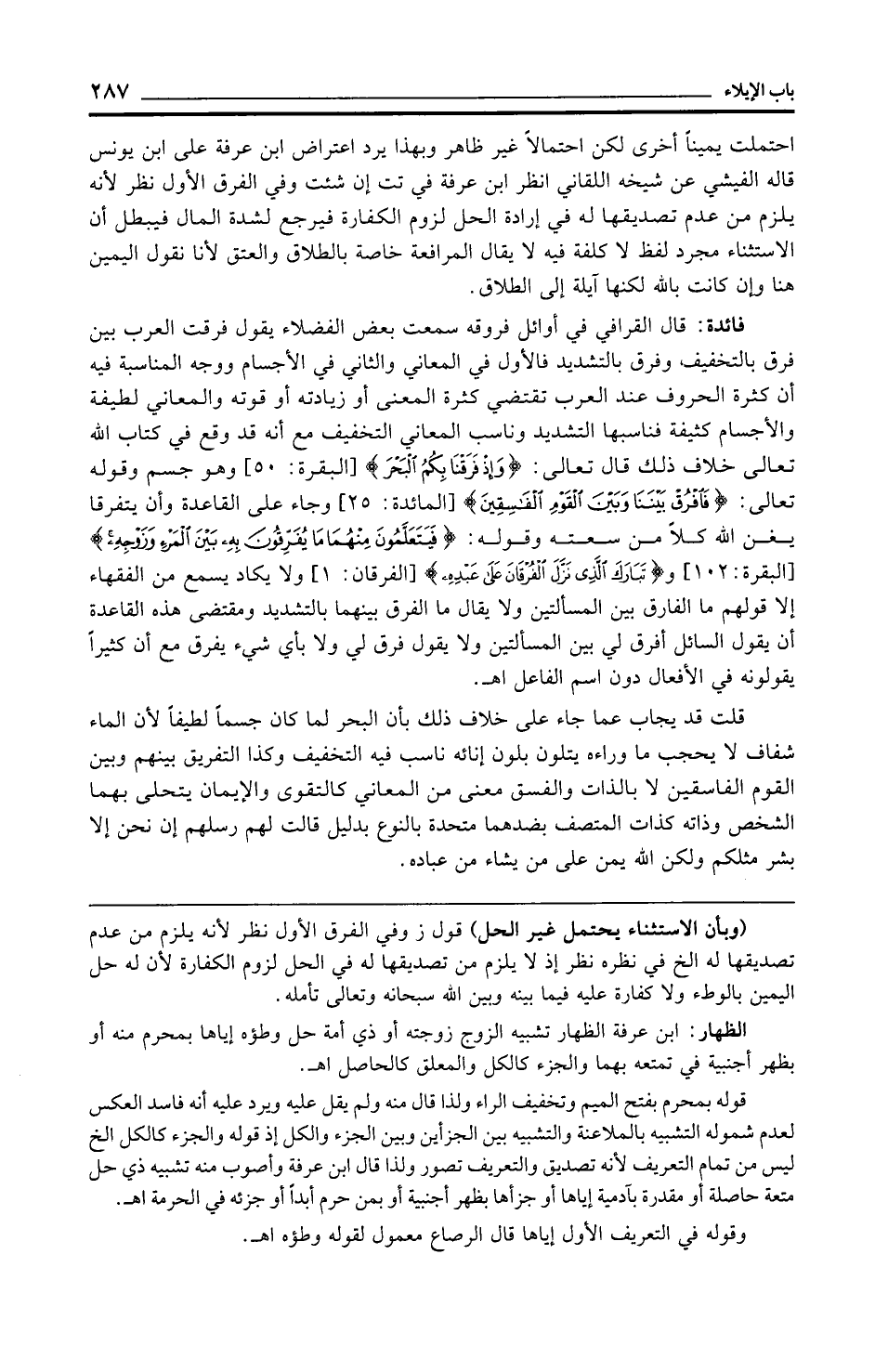 فائدة: قال القرافي في أوائل فروقه سمعت بعض الفضلاء يقول فرقت العرب بين فرق بالتخفيف وفرق بالتشديد فالأول في المعاني والثاني في الأجسام ووجه المناسبة فيه أن كثرة الحروف عند العرب تقتضي كثرة المعنى أو زيادته أو قوته والمعاني لطيفة والأجسام كثيفة فناسبها التشديد وناسب المعاني التخفيف مع أنه قد وقع في كتاب الله تعالى خلاف ذلك قال تعالى: {وَإِذْ فَرَقْنَا بِكُمُ الْبَحْرَ} [البقرة: 50] وهو جسم وقوله تعالى: {فَافْرُقْ بَيْنَنَا وَبَيْنَ الْقَوْمِ الْفَاسِقِينَ} [المائدة: 25] وجاء على القاعدة وأن يتفرقا يغن الله كلًّا من سعته وقوله: {فَيَتَعَلَّمُونَ مِنْهُمَا مَا يُفَرِّقُونَ بِهِ بَيْنَ الْمَرْءِ وَزَوْجِهِ} [البقرة: 102] و {تَبَارَكَ الَّذِي نَزَّلَ الْفُرْقَانَ عَلَى عَبْدِهِ} [الفرقان: 1] ولا يكاد يسمع من الفقهاء إلا قولهم ما الفارق بين المسألتين ولا يقال ما الفرق بينهما بالتشديد ومقتضى هذه القاعدة أن يقول السائل أفرق لي بين المسألتين ولا يقول فرق لي ولا بأي شيء يفرق مع أن كثيرًا يقولونه في الأفعال دون اسم الفاعل اهـ.