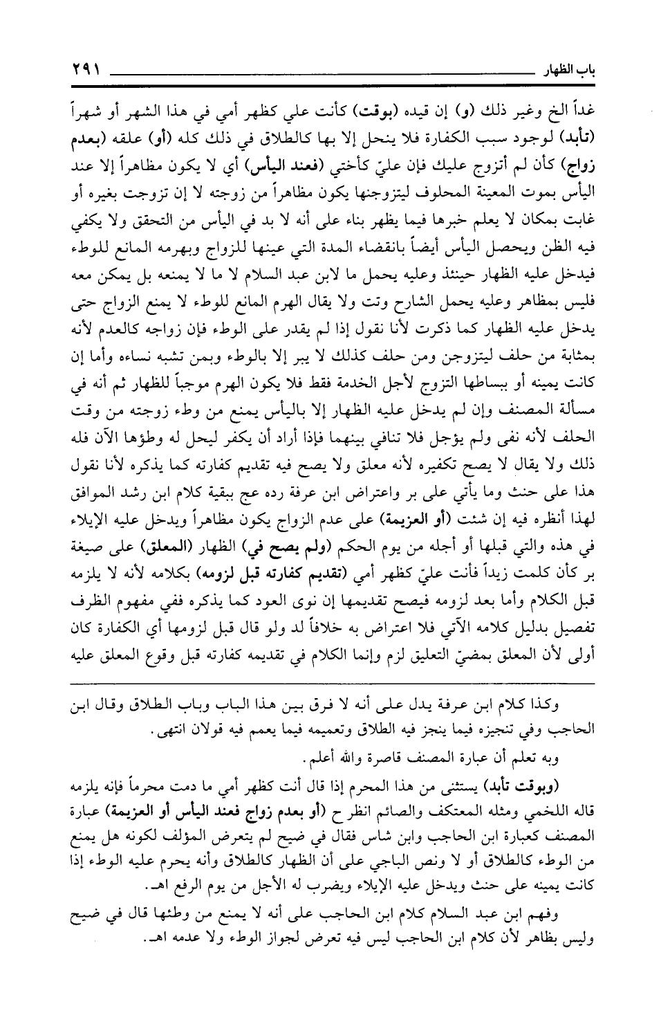 غدًا الخ وغير ذلك (و) إن قيده (بوقت) كأنت علي كظهر أمي في هذا الشهر أو شهرًا (تأبد) لوجود سبب الكفارة فلا ينحل إلا بها كالطلاق في ذلك كله (أو) علقه (بعدم زواج) كأن لم أتزوج عليك فإن عليّ كأختي (فعند اليأس) أي لا يكون مظاهرًا إلا عند اليأس بموت المعينة المحلوف ليتزوجنها يكون مظاهرًا من زوجته لا إن تزوجت بغيره أو غابت بمكان لا يعلم خبرها فيما يظهر بناء على أنه لا بد في اليأس من التحقق ولا يكفي فيه الظن ويحصل اليأس أيضًا بانقضاء المدة التي عينها للزواج وبهرمه المانع للوطء فيدخل عليه الظهار حينئذ وعليه يحمل ما لابن عبد السلام لا ما لا يمنعه بل يمكن معه فليس بمظاهر وعليه يحمل الشارح وقت ولا يقال الهرم المانع للوطء لا يمنع الزواج حتى يدخل عليه الظهار كما ذكرت لأنا نقول إذا لم يقدر على الوطء فإن زواجه كالعدم لأنه بمثابة من حلف ليتزوجن ومن حلف كذلك لا يبر إلا بالوطء وبمن تشبه نساءه وأما إن كانت يمينه أو ببساطها التزوج لأجل الخدمة فقط فلا يكون الهرم موجبًا للظهار ثم أنه في مسألة المصنف وإن لم يدخل عليه الظهار إلا باليأس يمنع من وطء زوجته من وقت الحلف لأنه نفى ولم يؤجل فلا تنافي بينهما فإذا أراد أن يكفر ليحل له وطؤها الآن فله ذلك ولا يقال لا يصح تكفيره لأنه معلق ولا يصح فيه تقديم كفارته كما يذكره لأنا نقول هذا على حنث وما يأتي على بر واعتراض ابن عرفة رده عج ببقية كلام ابن رشد الموافق لهذا أنظره فيه إن شئت (أو العزيمة) على عدم الزواج يكون مظاهرًا ويدخل عليه الإيلاء في هذه والتي قبلها أو أجله من يوم الحكم (ولم يصح في) الظهار (المعلق) على صيغة بر كأن كلمت زيدًا فأنت عليّ كظهر أمي (تقديم كفارته قبل لزومه) بكلامه لأنه لا يلزمه قبل الكلام وأما بعد لزومه فيصح تقديمها إن نوى العود كما يذكره ففي مفهوم الظرف تفصيل بدليل كلامه الآتي فلا اعتراض به خلافًا لد ولو قال قبل لزومها أي الكفارة كان أولى لأن المعلق بمضي التعليق لزم وإنما الكلام في تقديمه كفارته قبل وقوع المعلق عليه