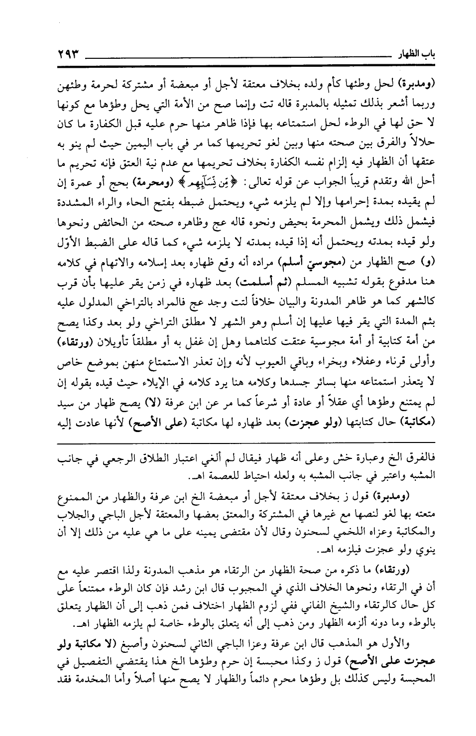 (ومدبرة) قول ز بخلاف معتقة لأجل أو مبعضة الخ ابن عرفة والظهار من الممنوع متعته بها لغو لنصها مع غيرها في المشتركة والمعتق بعضها والمعتقة لأجل الباجي والجلاب والمكاتبة وعزاه اللخمي لسحنون وقال لأن مقتضى يمينه على ما هي عليه من ذلك إلا أن ينوي ولو عجزت فيلزمه اهـ.