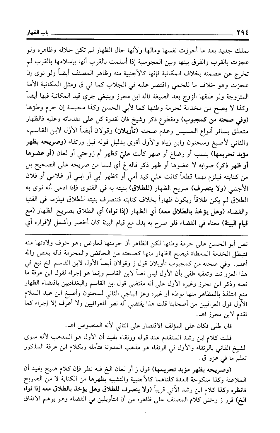 بملك جديد بعد ما أحرزت نفسها ومالها ولأنها حال الظهار لم تكن حلاله وظاهره ولو عجزت بالقرب والفرق بينها وبين المجوسية إذا أسلمت بالقرب أنها بإسلامها بالقرب لم تخرج عن عصمته بخلاف المكاتبة فإنها كالأجنبية منه وظاهر المصنف أيضًا ولو نوى إن عجزت وهو خلاف ما للخمي واقتصر عليه في الجلاب كما في ق ومثل المكاتبة الأمة المتزوجة ولو طلقها الزوج بعد الصيغة قاله ابن محرز وينبغي جري قيد المكاتبة فيها أيضًا وكذا لا يصح من مخدمة لحرمة وطئها كما لأبي الحسن وكذا محبسة إن حرم وطؤها (وفي صحته من كمجبوب) ومقطوع ذكر وشيخ فان لقدرة كل على مقدماته وعليه فالظهار متعلق بسائر أنواع المسيس وعدم صحته (تأويلان) وقولان أيضًا الأول لابن القاسم، والثاني لأصبغ وسحنون وابن زياد والأول أقوى بدليل قوله قبل ورتقاء (وصريحه بظهر مؤبد تحريمها) بنسب أو رضاع أو صهر كانت عليّ كظهر أم زوجتي أو لعان (أو عضوها أو ظهر ذكر) صوابه لا عضوها أو ظهر ذكر قاله غ أي ليسا من صريحه على الصحيح بل من كنايته فيلزم بهما قطعًا كانت علي كيد أمي أو كظهر أبي أو ابني أو غلامي أو فلان الأجنبي (ولا ينصرف) صريح الظهار (للطلاق) بنيته به في الفتوى فإذا ادعى أنه نوى به الطلاق لم يكن طلاقًا ويكون ظهارًا بخلاف كتابته فتنصرف بنيته للطلاق فيلزمه في الفتيا والقضاء (وهل يؤخذ بالطلاق معه) أي الظهار (إذا نواه) أي الطلاق بصريح الظهار (مع قيام البينة) معناه في القضاء فلو صرح به بدل مع قيام البينة كان أخصر وأشمل لإقراره أي