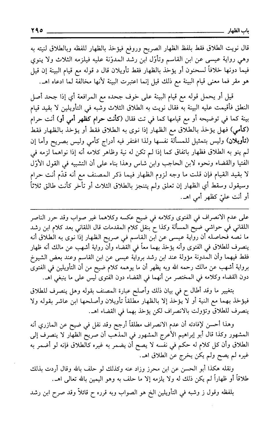 على عدم الانصراف في الفتوى وكلامه في ضيح عكسه وكلاهما غير صواب وقد حرر الناصر اللقاني في حواشي ضيح المسألة وكذا ح بنقل كلام المقدمات قال اللقاني بعد كلام ابن رشد ما نصه فحاصله أن رواية عيسى عن ابن القاسم في صريح الظهار إذا نوى به الطلاق أنه ينصرف للطلاق في الفتوى وأنه يؤخذ بهما معًا في القضاء وأن رواية أشهب عن مالك أنه ظهار فقط فيهما وأن المدونة مؤولة عند ابن رشد برواية عيسى عن ابن القاسم وعند بعض الشيوخ برواية أشهب عن مالك رحمه الله وبه يظهر أن ما يوهمه كلام ضيح من أن التأويلين في الفتوى دون القضاء وكلامه في المختصر من أنهما في القضاء دون الفتوى ليس على ما ينبغي اهـ.