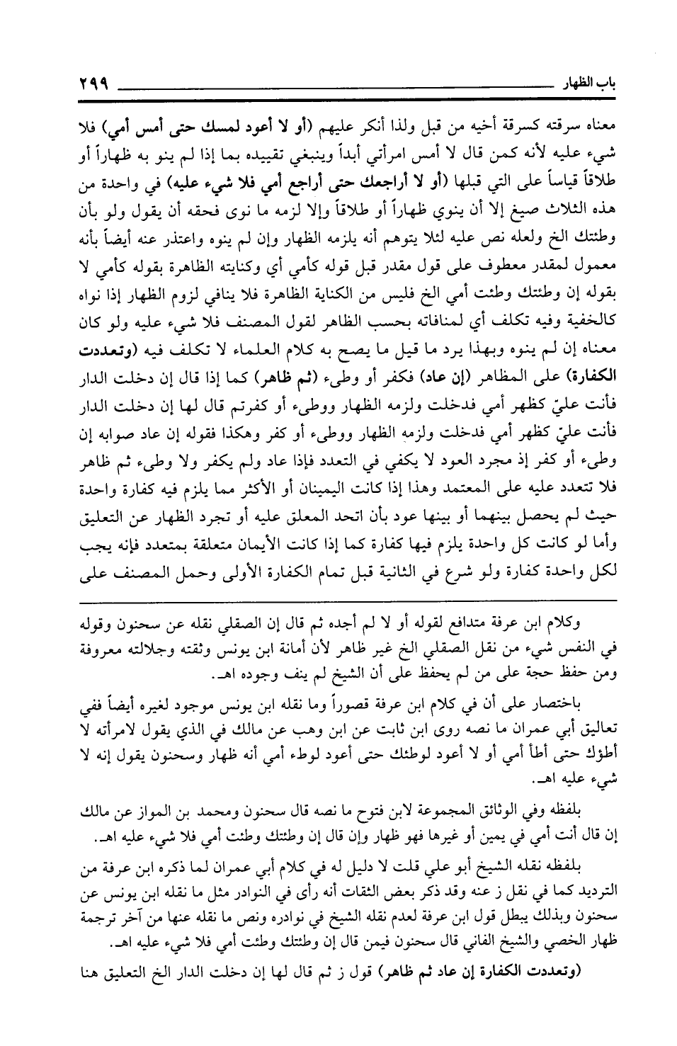 باختصار على أن في كلام ابن عرفة قصورًا وما نقله ابن يونس موجود لغيره أيضًا ففي تعاليق أبي عمران ما نصه روى ابن ثابت عن ابن وهب عن مالك في الذي يقول لامرأته لا أطؤك حتى أطأ أمي أو لا أعود لوطئك حتى أعود لوطء أمي أنه ظهار وسحنون يقول إنه لا شيء عليه اهـ.