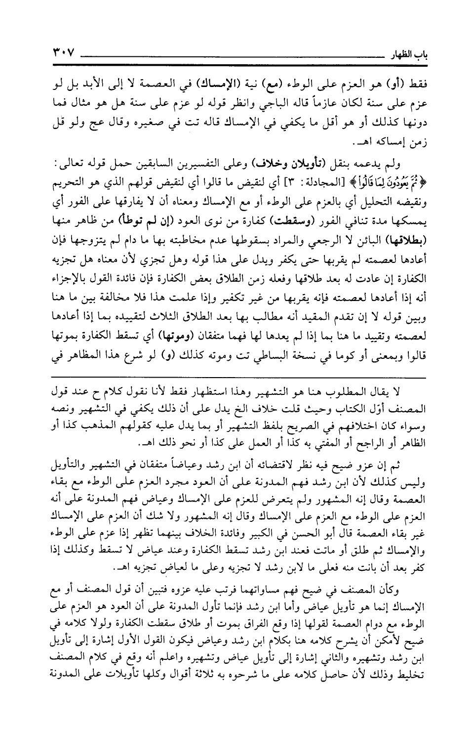 ثم إن عزو ضيح فيه نظر لاقتضائه أن ابن رشد وعياضًا متفقان في التشهير والتأويل وليس كذلك لأن ابن رشد فهم المدونة على أن العود مجرد العزم على الوطء مع بقاء العصمة وقال إنه المشهور ولم يتعرض للعزم على الإمساك وعياض فهم المدونة على أنه العزم على الوطء مع العزم على الإمساك وقال إنه المشهور ولا شك أن العزم على الإمساك غير بقاء العصمة قال أبو الحسن في الكبير وفائدة الخلاف بينهما تظهر إذا عزم على الوطء والإمساك ثم طلق أو ماتت فعند ابن رشد تسقط الكفارة وعند عياض لا تسقط وكذلك إذا كفر بعد أن بانت منه فعلى ما لابن رشد لا تجزيه وعلى ما لعياض تجزيه اهـ.