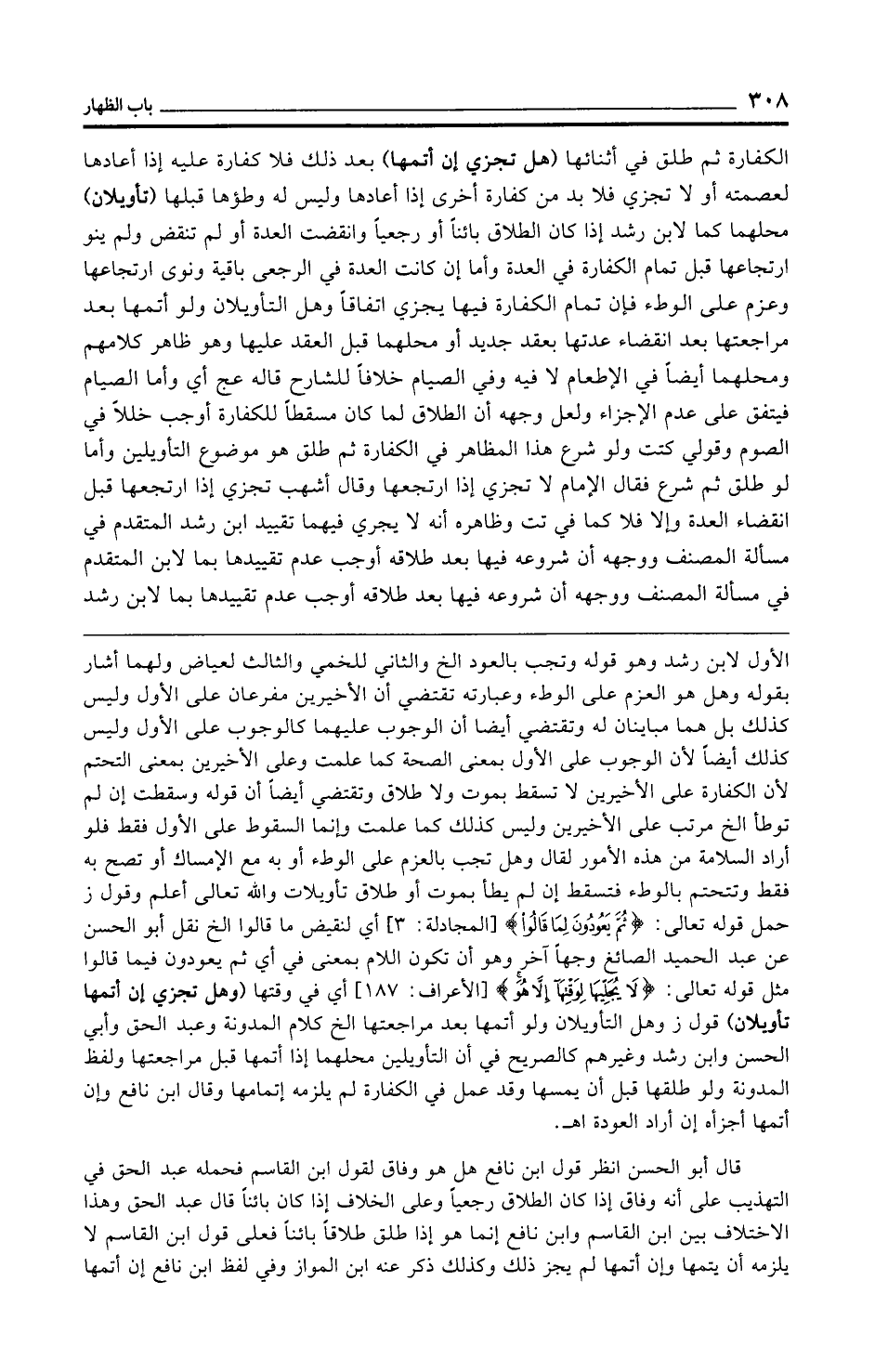 الكفارة ثم طلق في أثنائها (هل تجزي إن أتمها) بعد ذلك فلا كفارة عليه إذا أعادها لعصمته أو لا تجزي فلا بد من كفارة أخرى إذا أعادها وليس له وطؤها قبلها (تأويلان) محلهما كما لابن رشد إذا كان الطلاق بائنًا أو رجعيًّا وانقضت العدة أو لم تنقض ولم ينو ارتجاعها قبل تمام الكفارة في العدة وأما إن كانت العدة في الرجعى باقية ونوى ارتجاعها وعزم على الوطء فإن تمام الكفارة فيها يجزي اتفاقًا وهل التأويلان ولو أتمها بعد مراجعتها بعد انقضاء عدتها بعقد جديد أو محلهما قبل العقد عليها وهو ظاهر كلامهم ومحلهما أيضًا في الإطعام لا فيه وفي الصيام خلافًا للشارح قاله عج أي وأما الصيام فيتفق على عدم الإجزاء ولعل وجهه أن الطلاق لما كان مسقطًا للكفارة أوجب خللًا في الصوم وقولي كتت ولو شرع هذا المظاهر في الكفارة ثم طلق هو موضوع التأويلين وأما لو طلق ثم شرع فقال الإِمام لا تجزي إذا ارتجعها وقال أشهب تجزي إذا ارتجعها قبل انقضاء العدة وإلا فلا كما في تت وظاهره أنه لا يجري فيهما تقييد ابن رشد المتقدم في مسألة المصنف ووجهه أن شروعه فيها بعد طلاقه أوجب عدم تقييدها بما لابن المتقدم في مسألة المصنف ووجهه أن شروعه فيها بعد طلاقه أوجب عدم تقييدها بما لابن رشد