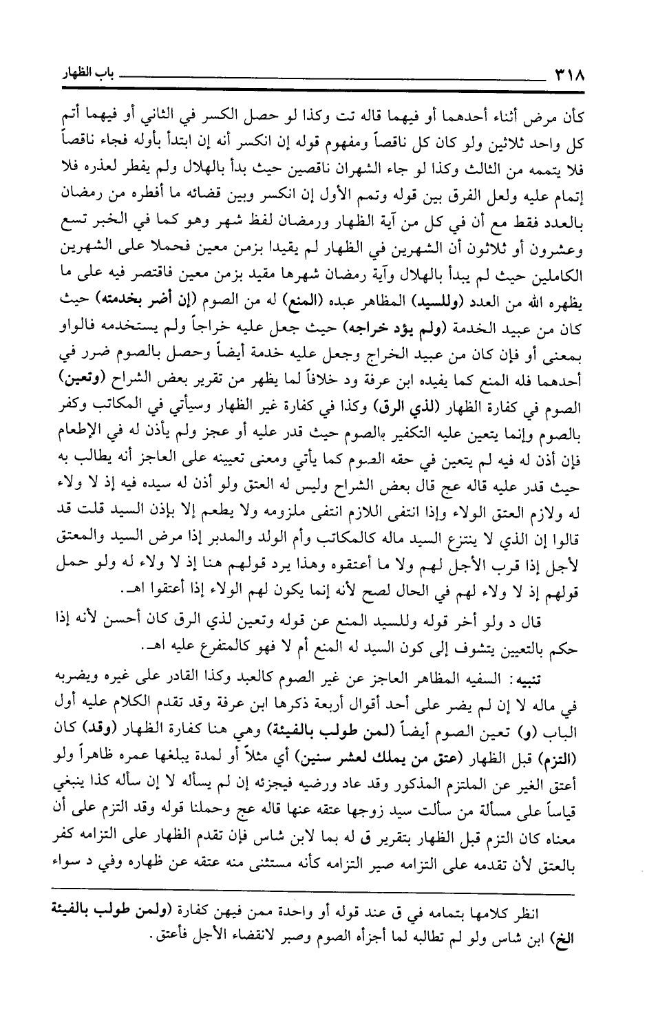 تنبيه: السفيه المظاهر العاجز عن غير الصوم كالعبد وكذا القادر على غيره ويضربه في ماله لا إن لم يضر على أحد أقوال أربعة ذكرها ابن عرفة وقد تقدم الكلام عليه أول الباب (و) تعين الصوم أيضًا (لمن طولب بالفيئة) وهي هنا كفارة الظهار (وقد) كان (التزم) قبل الظهار (عتق من يملك لعشر سنين) أي مثلًا أو لمدة يبلغها عمره ظاهرًا ولو أعتق الغير عن الملتزم المذكور وقد عاد ورضيه فيجزئه إن لم يسأله لا إن سأله كذا ينبغي قياسًا على مسألة من سألت سيد زوجها عتقه عنها قاله عج وحملنا قوله وقد التزم على أن معناه كان التزم قبل الظهار بتقرير ق له بما لابن شاس فإن تقدم الظهار على التزامه كفر بالعتق لأن تقدمه على التزامه سير التزامه كأنه مستثنى منه عتقه عن ظهاره وفي د سواء