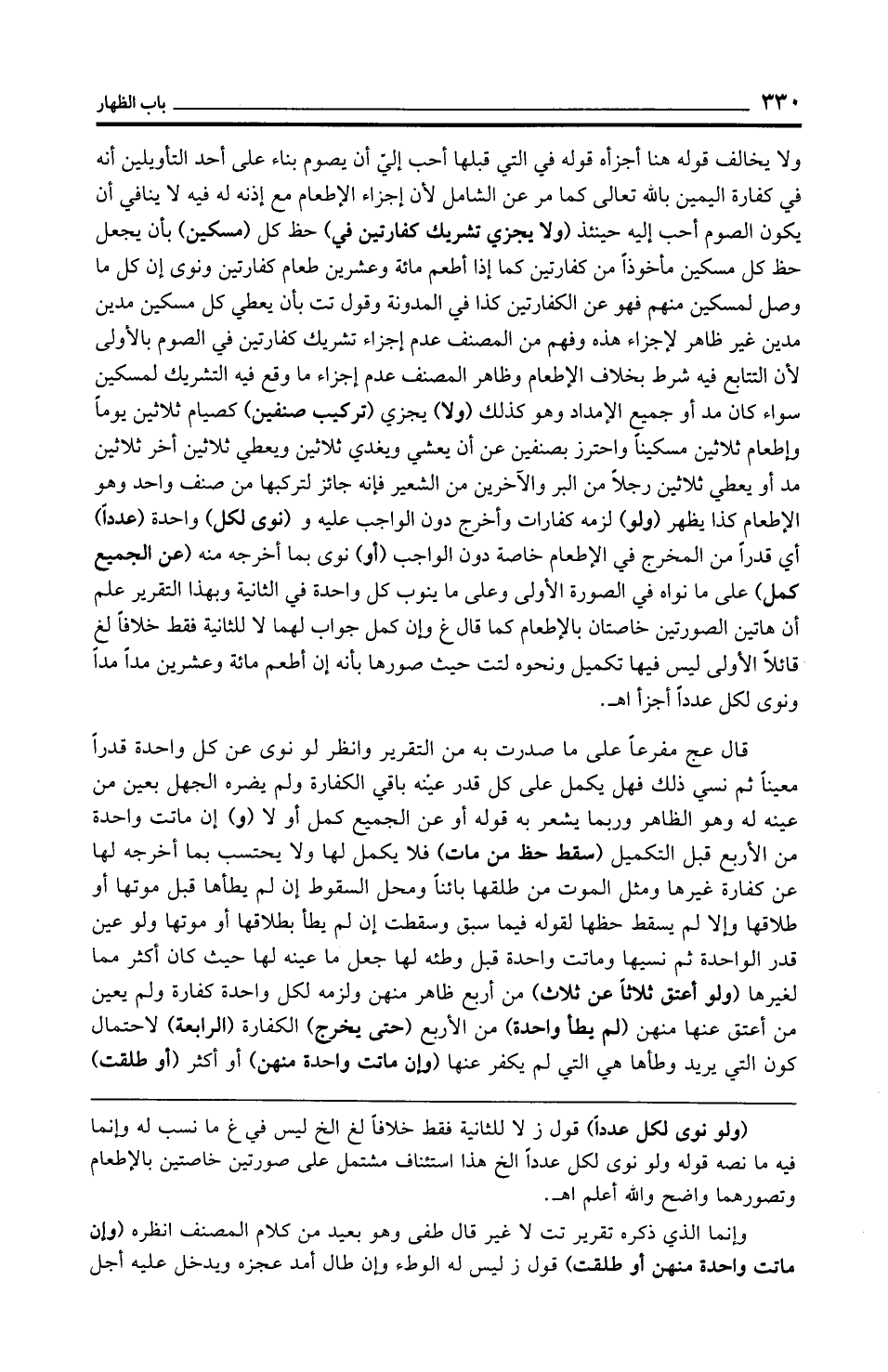 ولا يخالف قوله هنا أجزأه قوله في التي قبلها أحب إليّ أن يصوم بناء على أحد التأويلين أنه في كفارة اليمين بالله تعالى كما مر عن الشامل لأن إجزاء الإطعام مع إذنه له فيه لا ينافي أن يكون الصوم أحب إليه حينئذ (ولا يجزي تشريك كفارتين في) حظ كل (مسكين) بأن يجعل حظ كل مسكين مأخوذًا من كفارتين كما إذا أطعم مائة وعشرين طعام كفارتين ونوى إن كل ما وصل لمسكين منهم فهو عن الكفارتين كذا في المدونة وقول تت بأن يعطي كل مسكين مدين مدين غير ظاهر لإجزاء هذه وفهم من المصنف عدم إجزاء تشريك كفارتين في الصوم بالأولى لأن التتابع فيه شرط بخلاف الإطعام وظاهر المصنف عدم إجزاء ما وقع فيه التشريك لمسكين سواء كان مد أو جميع الإمداد وهو كذلك (ولا) يجزي (تركيب صنفين) كصيام ثلاثين يومًا وإطعام ثلاثين مسكينًا واحترز بصنفين عن أن يعشي ويغدي ثلاثين ويعطي ثلاثين أخر ثلاثين مد أو يعطي ثلاثين رجلًا من البر والآخرين من الشعير فإنه جائز لتركبها من صنف واحد وهو الإطعام كذا يظهر (ولو) لزمه كفارات وأخرج دون الواجب عليه و (نوى لكل) واحدة (عددًا) أي قدرًا من المخرج في الإطعام خاصة دون الواجب (أو) نوى بما أخرجه منه (عن الجميع كمل) على ما نواه في الصورة الأولى وعلى ما ينوب كل واحدة في الثانية وبهذا التقرير علم أن هاتين الصورتين خاصتان بالإطعام كما قال غ وإن كمل جواب لهما لا للثانية فقط خلافًا لغ قائلًا الأولى ليس فيها تكميل ونحوه لتت حيث صورها بأنه إن أطعم مائة وعشرين مدًّا مدًّا ونوى لكل عددًا أجزأ اهـ.