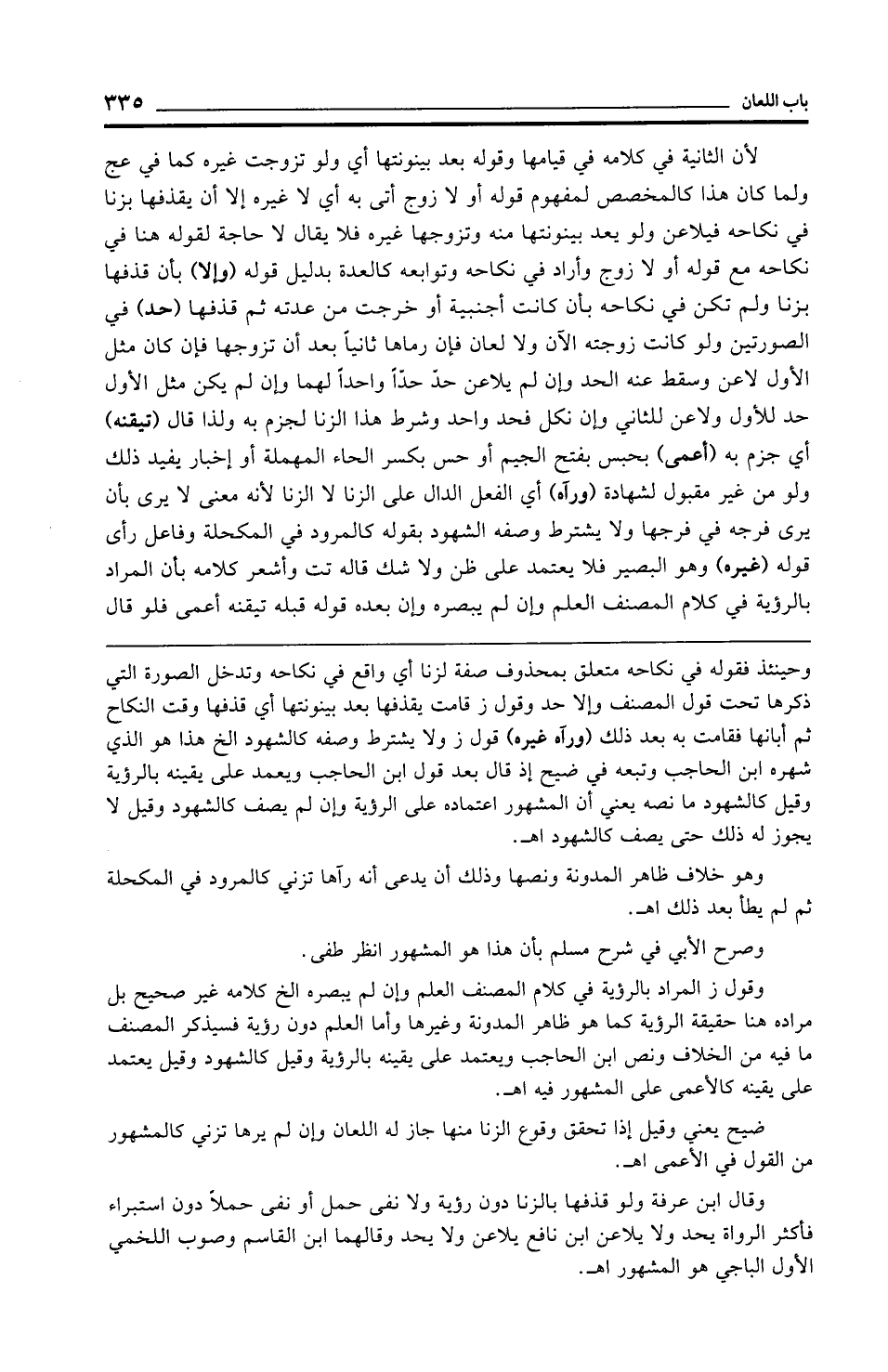 وقال ابن عرفة ولو قذفها بالزنا دون رؤية ولا نفى حمل أو نفى حملًا دون استبراء فأكثر الرواة يحد ولا يلاعن ابن نافع يلاعن ولا يحد وقالهما ابن القاسم وصوب اللخمي الأول الباجي هو المشهور اهـ.