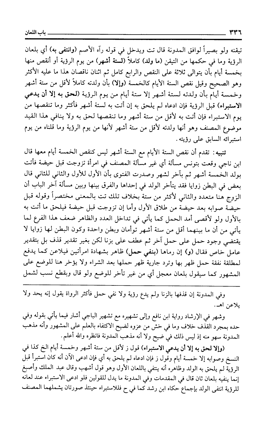 تيقنه ولو بصيرًا لوافق المدونة قال تت ويدخل في قوله رآه الأصم (وانتفى به) أي بلعان الرؤية وما في حكمها من التيقن (ما ولد) كاملًا (لستة أشهر) من يوم الرؤية أو أنقص منها بخمسة أيام بأن يتوالى ثلاثة على النقص والرابع كامل ثم اثنان ناقصان هذا ما عليه الأكثر وهو الصحيح وقيل نقص لستة الأيام كالخمسة (وإلا) بأن ولدته كاملًا لأقل من ستة أشهر وخمسة أيام بأن ولدته لستة أشهر إلا ستة أيام من يوم الرؤية (لحق به إلا أن يدعي الاستبراء) قبل الرؤية فإن ادعاه لم يلحق به إن أتت به لستة أشهر فأكثر وما تنقصها من يوم الاستبراء فإن أتت به لأقل من ستة أشهر وما تنقصها لحق به ولا ينافي هذا القيد موضوع المصنف وهو أنها ولدته لأقل من ستة أشهر لأنها من يوم الرؤية وما قلناه من يوم استبرائه السابق على رؤيته.