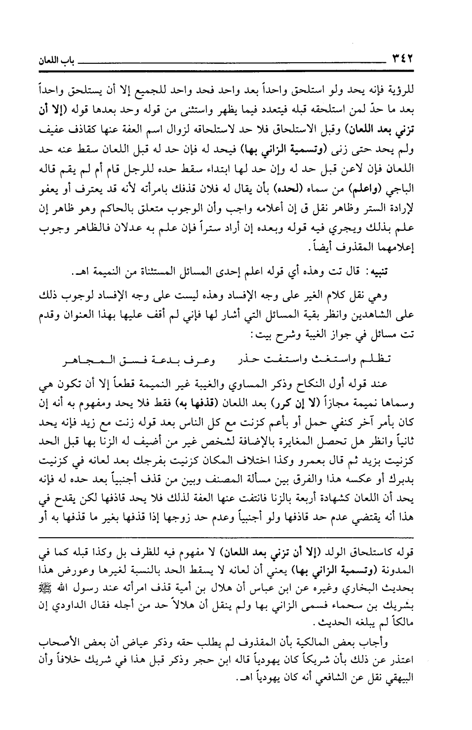 قوله كاستلحاق الولد (إلا أن تزني بعد اللعان) لا مفهوم فيه للظرف بل وكذا قبله كما في المدونة (وتسمية الزاني بها) يعني أن لعانه لا يسقط الحد بالنسبة لغيرها وعورض هذا بحديث البخاري وغيره عن ابن عباس أن هلال بن أمية قذف امرأته عند رسول الله - صلى الله عليه وسلم - بشريك بن سحماء فسمى الزاني بها ولم ينقل أن هلالًا حد من أجله فقال الداودي إن مالكًا لم يبلغه الحديث.