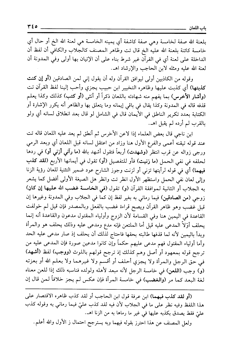 بلعنة الله صفة لخامسة وهي صفة كاشفة أي يمينه الخامسة هي لعنة الله الخ أو حال أي خامسة كائنة بلعنة الله عليه الخ قال تت وظاهر المصنف كالجلاب والكافي أن لفظ أن الداخلة على لعنة أي في القرآن غير شرط بناء على أن الإتيان بها أولى وفي المدونة أن لعنة الله عليه ومثله لابن الحاجب والإرشاد اهـ.