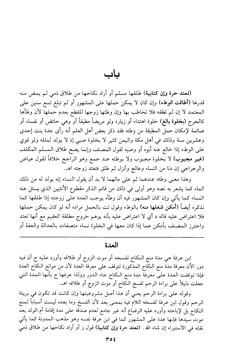 (تعتد حرة وإن كتابية) طلقها مسلم أو أراد نكاحها من طلاق ذمي لم يمض منه قدرها (أطاقت الوطء) وإن كان لا يمكن حملها على المشهور أو لم تبلغ تسع سنين على المعتمد لا إن لم تطقه فلا تخاطب بها وإن وطئها زوجها للقطع بعدم حملها لأن وطأها كالجرح (بخلوة بالغ) خلوة اهتداء أو زيارة ولو مريضًا مطيقًا أو وهي حائض أو نفساء أو صائمة لإمكان حمل المطيقة من وطئه فقد ذكر بعض أهل العلم أنه رأى جدة بنت إحدى وعشرين سنة وذلك في أهل مكة واليمن كثير لا بخلوة صبي إذ لا يولد لمثله ولو قوي على الوطء إذا خالع عنه أبوه أو وصيه لقول المصنف وإنما يصح طلاق المسلم المكلف (غير مجبوب) لا بخلوة مجبوب ولا بوطئه عند جمع وهو الراجح خلافًا لقول عياض والرجراجي إن دنا من النساء وعالج وأنزل ثم طلق فتعتد زوجته اهـ.