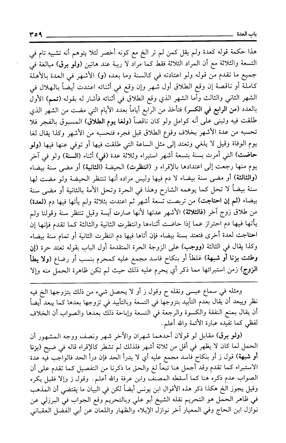 هذا حكمة قوله كعدة ولم يقل كمن لم تر الخ مع كونه أخصر لئلا يتوهم أنه تشبيه تام في التسعة والثلاثة مع أن المراد الثلاثة فقط كما مراد لا ريبة عند هاتين (ولو برق) مبالغة في جميع ما تقدم من قوله ولو اعتادته في كالسنة وما بعده (و) الأشهر في العدة بالأهلة كاملة أو ناقصة إن وقع الطلاق أول شهر وإن وقع في أثنائه اعتدت أيضًا بالهلال في الشهر الثاني والثالث وأما الشهر الذي وقع الطلاق في أثنائه فأشار له بقوله (تمم) الأول بالعدد (من الرابع في الكسر) فتأخذ من الرابع أيامًا بعدد الأيام التي مضت من الشهر الذي طلقت فيه وتبنى على أنه كوامل ولو كان ناقصًا (ولغا يوم الطلاق) المسبوق بالفجر فلا تحسبه من عدة الأشهر بخلاف وقوع الطلاق قبل فجره فتحسبه من الأشهر وكذا يقال لغا يوم الوفاة وقيل لا يلغي وتعتد إلى مثل الساعة التي طلقت فيها أو توفي عنها فيها (ولو حاضت) التي أمرت بسنة بتسعة أشهر استبراء وثلاثة عدة (في) أثناء (السنة) ولو في آخر يوم منها رجعت إلى اعتدادها بالإقراء و (انتظرت) الحيضة (الثانية) أو مضى سنة بيضاء (والثالثة) أو مضى سنة بيضاء لا دم فيها وليس مراده أنها تنتظر الحيضة ولو مضت لها سنة بيضًا لا تحل كما يوهمه الشارح وهذا في الحرة وتحل الأمة بالثانية أو مضى سنة بيضاء (ثم إن احتاجت) من تربصت تسعة أشهر ثم اعتدت بثلاثة ولم يأتها فيها دم (لعدة) من طلاق زوج آخر (فالثلاثة) الأشهر عدتها لأنها صارت آيسة وقيل تنتظر سنة وقولنا ولم يأتها فيها دم احتراز عما إذا حاضت أثناءها وانتظرت الثانية والثالثة كما تقدم فإنها إن احتاجت لعدة أخرى فتعتد بسنة بيضاء فإن أتاها فيها دم انتظرت الثانية أو تمام سنة بيضاء وكذا يقال في الثالثة (ووجب) على الزوجة الحرة المتقدمة أول الباب بقوله تعتد حرة (إن وطئت بزنا أو شبهة) غلطًا أو بنكاح فاسد مجمع عليه كمحرم بنسب أو رضاع (ولا يطأ الزوج) زمن استبرائها مما ذكر أي يحرم عليه ذلك حيث لم تكن ظاهرة الحمل منه وإلا