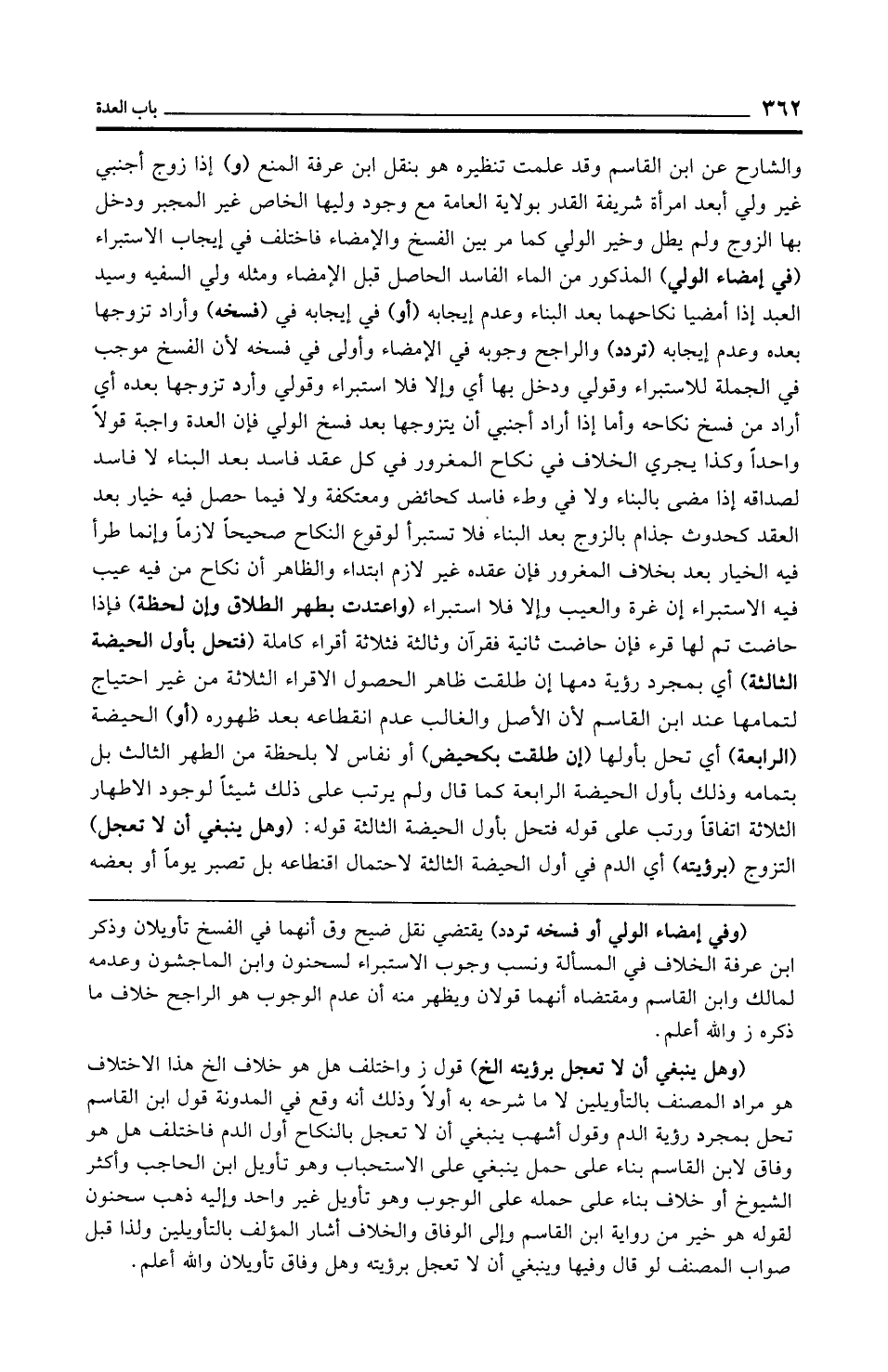 والشارح عن ابن القاسم وقد علمت تنظيره هو بنقل ابن عرفة المنع (و) إذا زوج أجنبي غير ولي أبعد امرأة شريفة القدر بولاية العامة مع وجود وليها الخاص غير المجبر ودخل بها الزوج ولم يطل وخير الولي كما مر بين الفسخ والإمضاء فاختلف في إيجاب الاستبراء (في إمضاء الولي) المذكور من الماء الفاسد الحاصل قبل الإمضاء ومثله ولي السفيه وسيد العبد إذا أمضيا نكاحهما بعد البناء وعدم إيجابه (أو) في إيجابه في (فسخه) وأراد تزوجها بعده وعدم إيجابه (تردد) والراجح وجوبه في الإمضاء وأولى في فسخه لأن الفسخ موجب في الجملة للاستبراء وقولي ودخل بها أي وإلا فلا استبراء وقولي وأرد تزوجها بعده أي أراد من فسخ نكاحه وأما إذا أراد أجنبي أن يتزوجها بعد فسخ الولي فإن العدة واجبة قولًا واحدًا وكذا يجري الخلاف في نكاح المغرور في كل عقد فاسد بعد البناء لا فاسد لصداقه إذا مضى بالبناء ولا في وطء فاسد كحائض ومعتكفة ولا فيما حصل فيه خيار بعد العقد كحدوث جذام بالزوج بعد البناء فلا تستبرأ لوقوع النكاح صحيحًا لازمًا وإنما طرأ فيه الخيار بعد بخلاف المغرور فإن عقده غير لازم ابتداء والظاهر أن نكاح من فيه عيب فيه الاستبراء إن غرة والعيب وإلا فلا استبراء (واعتدت بطهر الطلاق وإن لحظة) فإذا حاضت تم لها قرء فإن حاضت ثانية فقرآن وثالثة فثلاثة أقراء كاملة (فتحل بأول الحيضة الثالثة) أي بمجرد رؤية دمها إن طلقت ظاهر الحصول الأقراء الثلاثة من غير احتياج لتمامها عند ابن القاسم لأن الأصل والغالب عدم انقطاعه بعد ظهوره (أو) الحيضة (الرابعة) أي تحل بأولها (إن طلقت بكحيض) أو نفاس لا بلحظة من الطهر الثالث بل بتمامه وذلك بأول الحيضة الرابعة كما قال ولم يرتب على ذلك شيئًا لوجود الأطهار الثلاثة اتفاقًا ورتب على قوله فتحل بأول الحيضة الثالثة قوله: (وهل ينبغي أن لا تعجل) التزوج (برؤيته) أي الدم في أول الحيضة الثالثة لاحتمال انقطاعه بل تصبر يومًا أو بعضه