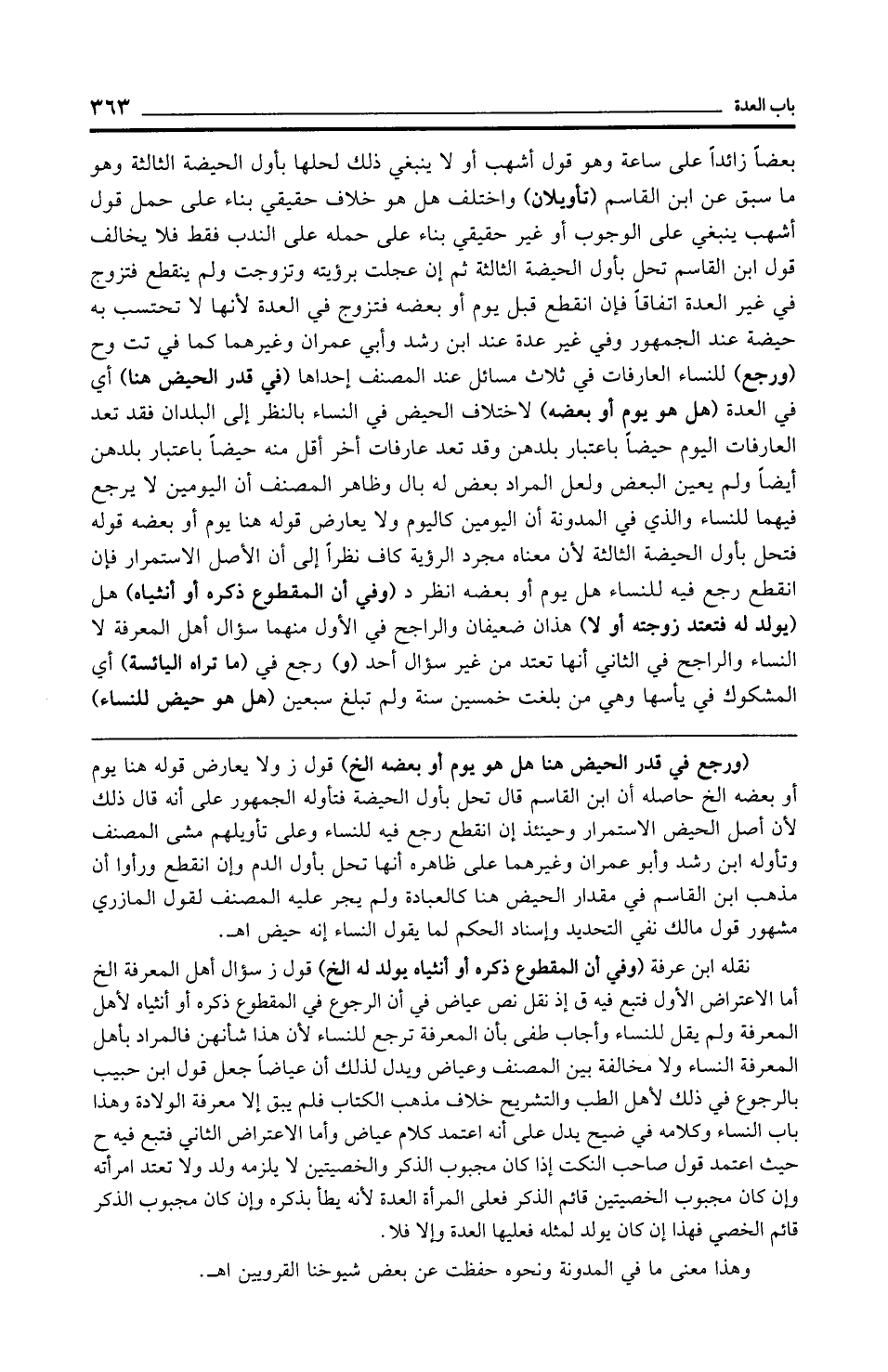 بعضًا زائدًا على ساعة وهو قول أشهب أو لا ينبغي ذلك لحلها بأول الحيضة الثالثة وهو ما سبق عن ابن القاسم (تأويلان) واختلف هل هو خلاف حقيقي بناء على حمل قول أشهب ينبغي على الوجوب أو غير حقيقي بناء على حمله على الندب فقط فلا يخالف قول ابن القاسم تحل بأول الحيضة الثالثة ثم إن عجلت برؤيته وتزوجت ولم ينقطع فتزوج في غير العدة اتفاقًا فإن انقطع قبل يوم أو بعضه فتزوج في العدة لأنها لا تحتسب به حيضة عند الجمهور وفي غير عدة عند ابن رشد وأبي عمران وغيرهما كما في تت وح (ورجع) للنساء العارفات في ثلاث مسائل عند المصنف إحداها (في قدر الحيض هنا) أي في العدة (هل هو يوم أو بعضه) لاختلاف الحيض في النساء بالنظر إلى البلدان فقد تعد العارفات اليوم حيضًا باعتبار بلدهن وقد تعد عارفات أخر أقل منه حيضًا باعتبار بلدهن أيضًا ولم يعين البعض ولعل المراد بعض له بال وظاهر المصنف أن اليومين لا يرجع فيهما للنساء والذي في المدونة أن اليومين كاليوم ولا يعارض قوله هنا يوم أو بعضه قوله فتحل بأول الحيضة الثالثة لأن معناه مجرد الرؤية كاف نظرًا إلى أن الأصل الاستمرار فإن انقطع رجع فيه للنساء هل يوم أو بعضه انظر د (وفي أن المقطوع ذكره أو أنثياه) هل (يولد له فتعتد زوجته أو لا) هذان ضعيفان والراجح في الأول منهما سؤال أهل المعرفة لا النساء والراجح في الثاني أنها تعتد من غير سؤال أحد (و) رجع في (ما تراه اليائسة) أي المشكوك في يأسها وهي من بلغت خمسين سنة ولم تبلغ سبعين (هل هو حيض للنساء)