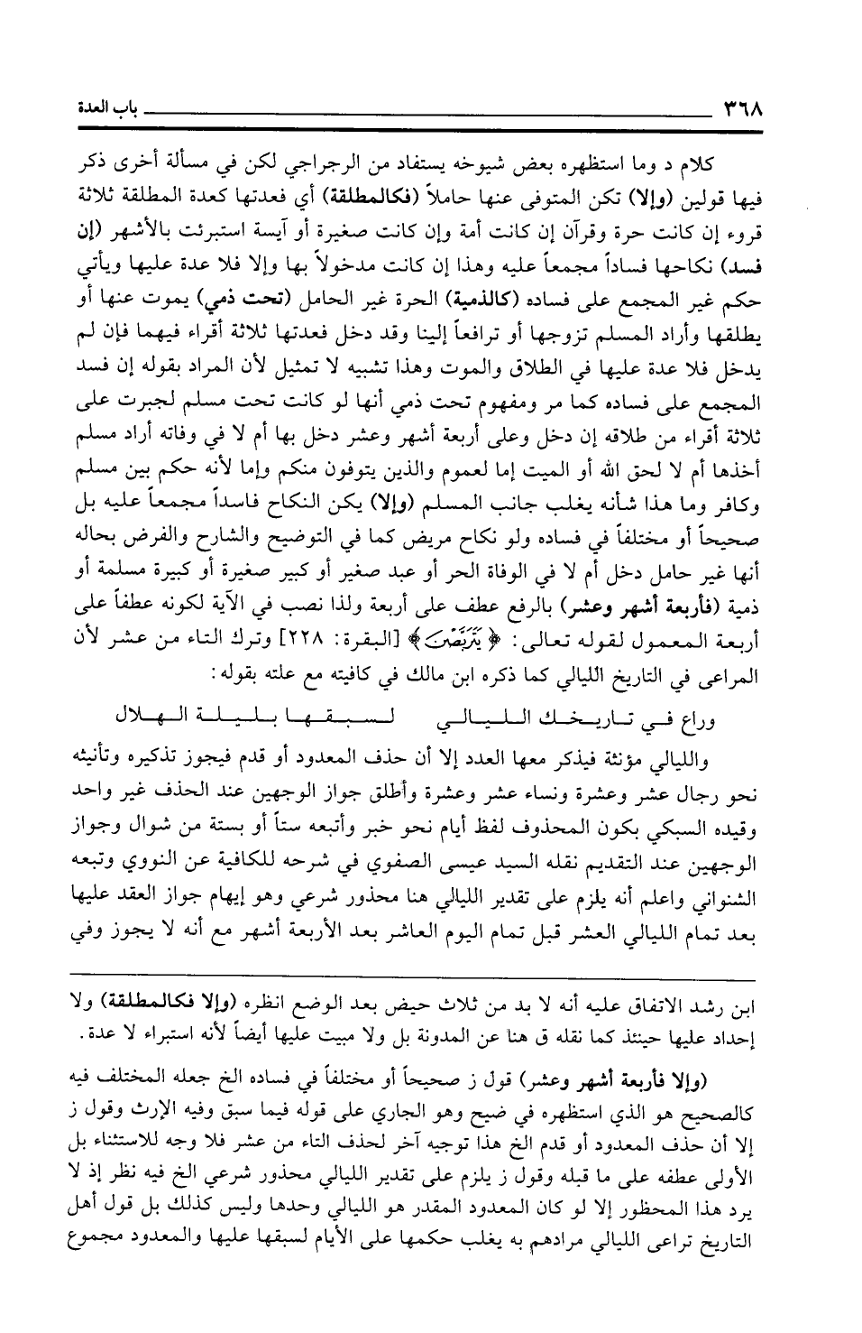 كلام د وما استظهره بعض شيوخه يستفاد من الرجراجي لكن في مسألة أخرى ذكر فيها قولين (وإلا) تكن المتوفى عنها حاملًا (فكالمطلقة) أي فعدتها كعدة المطلقة ثلاثة قروء إن كانت حرة وقرآن إن كانت أمة وإن كانت صغيرة أو آيسة استبرئت بالأشهر (إن فسد) نكاحها فسادًا مجمعًا عليه وهذا إن كانت مدخولًا بها وإلا فلا عدة عليها ويأتي حكم غير المجمع على فساده (كالذمية) الحرة غير الحامل (تحت ذمي) يموت عنها أو يطلقها وأراد المسلم تزوجها أو ترافعا إلينا وقد دخل فعدتها ثلاثة أقراء فيهما فإن لم يدخل فلا عدة عليها في الطلاق والموت وهذا تشبيه لا تمثيل لأن المراد بقوله إن فسد المجمع على فساده كما مر ومفهوم تحت ذمي أنها لو كانت تحت مسلم لجبرت على ثلاثة أقراء من طلاقه إن دخل وعلى أربعة أشهر وعشر دخل بها أم لا في وفاته أراد مسلم أخذها أم لا لحق الله أو الميت إما لعموم والذين يتوفون منكم وإما لأنه حكم بين مسلم وكافر وما هذا شأنه يغلب جانب المسلم (وإلا) يكن النكاح فاسدًا مجمعًا عليه بل صحيحًا أو مختلفًا في فساده ولو نكاح مريض كما في التوضيح والشارح والفرض بحاله أنها غير حامل دخل أم لا في الوفاة الحر أو عبد صغير أو كبير صغيرة أو كبيرة مسلمة أو ذمية (فأربعة أشهر وعشر) بالرفع عطف على أربعة ولذا نصب في الآية لكونه عطفًا على أربعة المعمول لقوله تعالى: {يَتَرَبَّصْنَ} [البقرة: 228] وترك التاء من عشر لأن المراعى في التاريخ الليالي كما ذكره ابن مالك في كافيته مع علته بقوله: