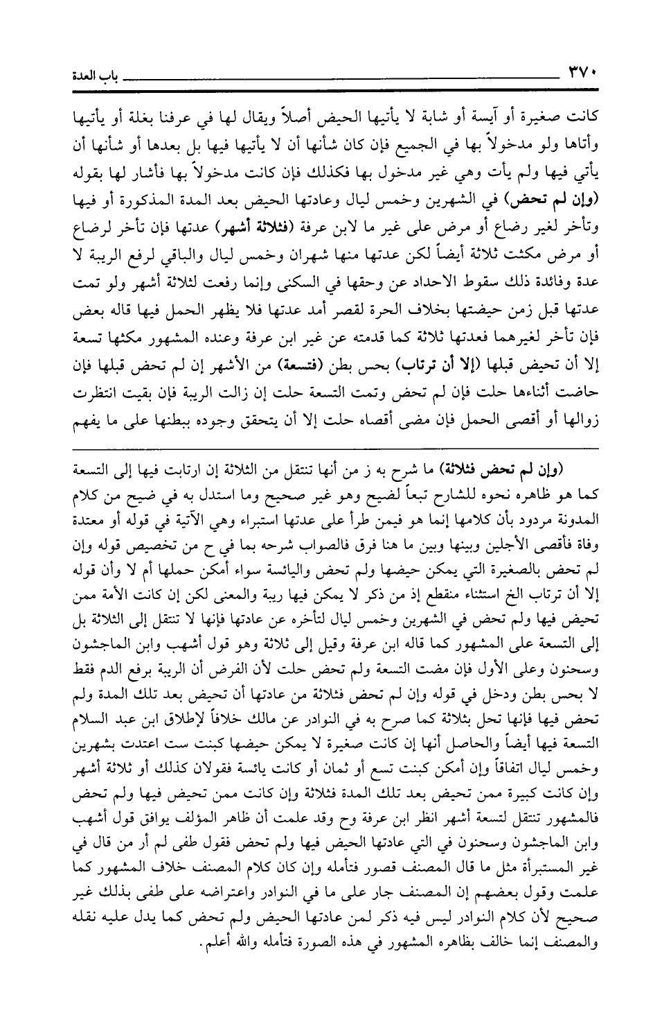 كانت صغيرة أو آيسة أو شابة لا يأتيها الحيض أصلًا ويقال لها في عرفنا بغلة أو يأتيها وأتاها ولو مدخولًا بها في الجميع فإن كان شأنها أن لا يأتيها فيها بل بعدها أو شأنها أن يأتي فيها ولم يأت وهي غير مدخول بها فكذلك فإن كانت مدخولًا بها فأشار لها بقوله (وإن لم تحض) في الشهرين وخمس ليال وعادتها الحيض بعد المدة المذكورة أو فيها وتأخر لغير رضاع أو مرض على غير ما لابن عرفة (فثلاثة أشهر) عدتها فإن تأخر لرضاع أو مرض مكثت ثلاثة أيضًا لكن عدتها منها شهران وخمس ليال والباقي لرفع الريبة لا عدة وفائدة ذلك سقوط الإحداد عن وحقها في السكنى وإنما رفعت لثلاثة أشهر ولو تمت عدتها قبل زمن حيضتها بخلاف الحرة لقصر أمد عدتها فلا يظهر الحمل فيها قاله بعض فإن تأخر لغيرهما فعدتها ثلاثة كما قدمته عن غير ابن عرفة وعنده المشهور مكثها تسعة إلا أن تحيض قبلها (إلا أن ترتاب) بحس بطن (فتسعة) من الأشهر إن لم تحض قبلها فإن حاضت أثناءها حلت فإن لم تحض وتمت التسعة حلت إن زالت الريبة فإن بقيت انتظرت زوالها أو أقصى الحمل فإن مضى أقصاه حلت إلا أن يتحقق وجوده ببطنها على ما يفهم