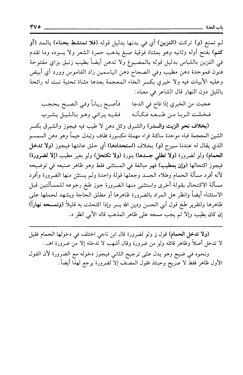 (بخلاف نحو الزيت والسدر) والشبرق وكل دهن لا طيب فيه فيجوز والشبرق بكسر الشين المعجمة فباء موحدة ساكنة فراء مهملة مكسورة فقاف وتبدل جيمًا وهو دهن السمسم الذي يقال له عندنا سيرج (و) بخلاف (استحدادها) أي حلق عانتها فيجوز (ولا تدخل الحمام) ولو لضرورة (ولا تطلي جسدها) بنورة (ولا تكتحل) ولو بغير مطيب (إلا لضرورة) فيجوز اكتحالها (وإن بمطيب) فهو مبالغة في المستثنى فقط وهو ظاهر صنيعه في توضيحه لأنه أفرد مسألة الحمام وطلاء الجسد وجعلها قولة واحدة ولم يستثن منها الضرورة وأفرد مسألة الاكتحال بقولة أخرى واستثنى منها الضرورة جوز طخ رجوعه للمسألتين قبل الاستثناء أيضًا وانظر هل المراد بالضرورة ظاهرها أو مطلق الحاجة ويشهد لحملها على ظاهرها ولتقرير طخ قول أبي الحسن ودين الله يسر وإذا اكتحلت به قليلًا (وتمسحه نهارًا) إن كان بطيب وإلا لم يجب مسحه على ظاهر المذهب قاله الأبي انظر د.