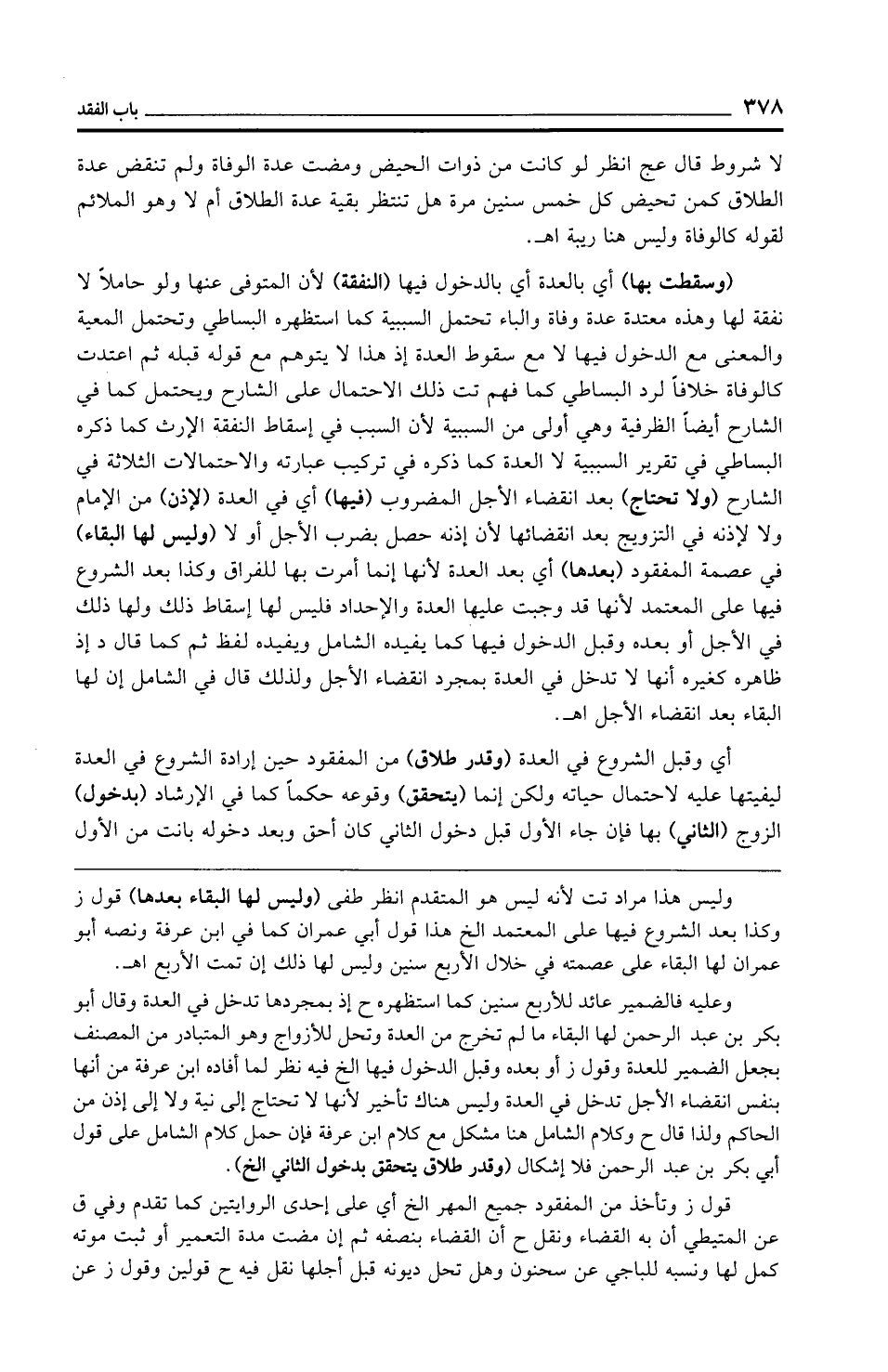 (وسقطت بها) أي بالعدة أي بالدخول فيها (النفقة) لأن المتوفى عنها ولو حاملًا لا نفقة لها وهذه معتدة عدة وفاة والباء تحتمل السببية كما استظهره البساطي وتحتمل المعية والمعنى مع الدخول فيها لا مع سقوط العدة إذ هذا لا يتوهم مع قوله قبله ثم اعتدت كالوفاة خلافًا لرد البساطي كما فهم تت ذلك الاحتمال على الشارح ويحتمل كما في الشارح أيضًا الظرفية وهي أولى من السببية لأن السبب في إسقاط النفقة الإرث كما ذكره البساطي في تقرير السببية لا العدة كما ذكره في تركيب عبارته والاحتمالات الثلاثة في الشارح (ولا تحتاج) بعد انقضاء الأجل المضروب (فيها) أي في العدة (لإذن) من الإِمام ولا لإذنه في التزويج بعد انقضائها لأن إذنه حصل بضرب الأجل أو لا (وليس لها البقاء) في عصمة المفقود (بعدها) أي بعد العدة لأنها إنما أمرت بها للفراق وكذا بعد الشروع فيها على المعتمد لأنها قد وجبت عليها العدة والإحداد فليس لها إسقاط ذلك ولها ذلك في الأجل أو بعده وقبل الدخول فيها كما يفيده الشامل ويفيده لفظ ثم كما قال د إذ ظاهره كغيره أنها لا تدخل في العدة بمجرد انقضاء الأجل ولذلك قال في الشامل إن لها البقاء بعد انقضاء الأجل اهـ.