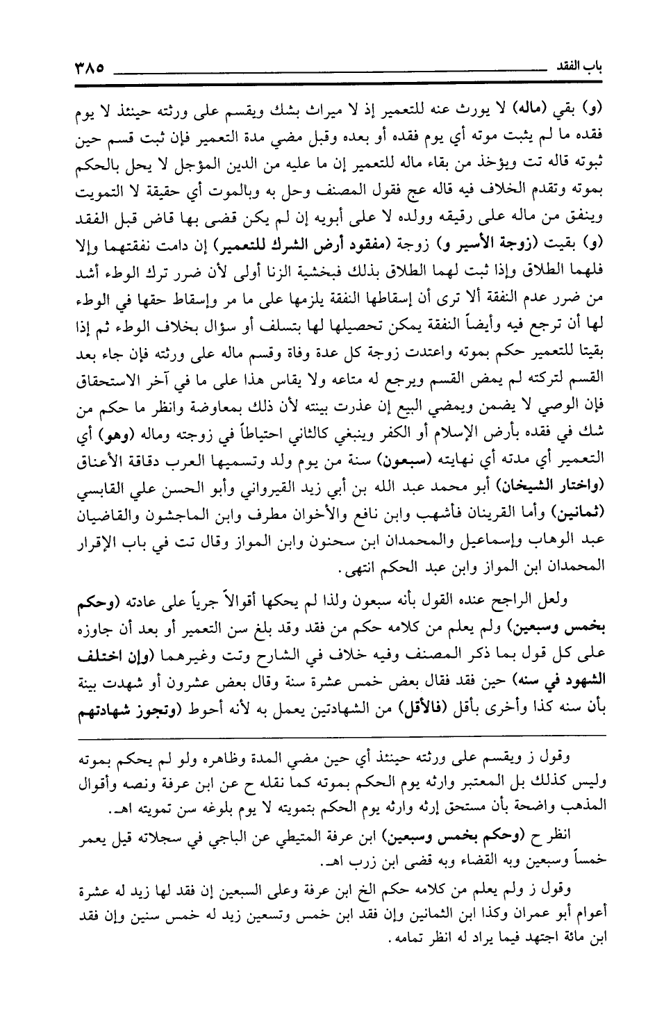 (و) بقي (ماله) لا يورث عنه للتعمير إذ لا ميراث بشك ويقسم على ورثته حينئذ لا يوم فقده ما لم يثبت موته أي يوم فقده أو بعده وقبل مضي مدة التعمير فإن ثبت قسم حين ثبوته قاله تت ويؤخذ من بقاء ماله للتعمير إن ما عليه من الدين المؤجل لا يحل بالحكم بموته وتقدم الخلاف فيه قاله عج فقول المصنف وحل به وبالموت أي حقيقة لا التمويت وينفق من ماله على رقيقه وولده لا على أبويه إن لم يكن قضى بها قاض قبل الفقد (و) بقيت (زوجة الأسير و) زوجة (مفقود أرض الشرك للتعمير) إن دامت نفقتهما وإلا فلهما الطلاق وإذا ثبت لهما الطلاق بذلك فبخشية الزنا أولى لأن ضرر ترك الوطء أشد من ضرر عدم النفقة ألا ترى أن إسقاطها النفقة يلزمها على ما مر وإسقاط حقها في الوطء لها أن ترجع فيه وأيضًا النفقة يمكن تحصيلها لها بتسلف أو سؤال بخلاف الوطء ثم إذا بقيتا للتعمير حكم بموته واعتدت زوجة كل عدة وفاة وقسم ماله على ورثته فإن جاء بعد القسم لتركته لم يمض القسم ويرجع له متاعه ولا يقاس هذا على ما في آخر الاستحقاق فإن الوصي لا يضمن ويمضي البيع إن عذرت بينته لأن ذلك بمعاوضة وانظر ما حكم من شك في فقده بأرض الإِسلام أو الكفر وينبغي كالثاني احتياطًا في زوجته وماله (وهو) أي التعمير أي مدته أي نهايته (سبعون) سنة من يوم ولد وتسميها العرب دقاقة الأعناق (واختار الشيخان) أبو محمَّد عبد الله بن أبي زيد القيرواني وأبو الحسن علي القابسي (ثمانين) وأما القرينان فأشهب وابن نافع والأخوان مطرف وابن الماجشون والقاضيان عبد الوهاب وإسماعيل والمحمدان ابن سحنون وابن المواز وقال تت في باب الإقرار المحمدان ابن المواز وابن عبد الحكم انتهى.