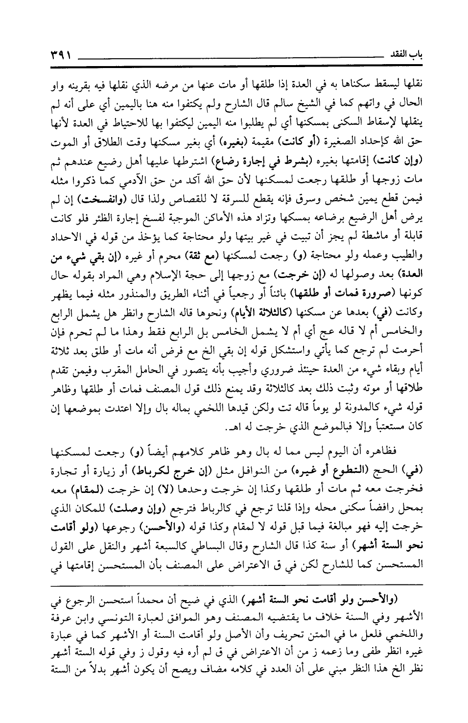 نقلها ليسقط سكناها به في العدة إذا طلقها أو مات عنها من مرضه الذي نقلها فيه بقرينه واو الحال في واتهم كما في الشيخ سالم قال الشارح ولم يكتفوا منه هنا باليمين أي على أنه لم ينقلها لإسقاط السكنى بمسكنها أي لم يطلبوا منه اليمين ليكتفوا بها للاحتياط في العدة لأنها حق الله كإحداد الصغيرة (أو كانت) مقيمة (بغيره) أي بغير مسكنها وقت الطلاق أو الموت (وإن كانت) إقامتها بغيره (بشرط في إجارة رضاع) اشترطها عليها أهل رضيع عندهم ثم مات زوجها أو طلقها رجعت لمسكنها لأن حق الله آكد من حق الآدمي كما ذكروا مثله فيمن قطع يمين شخص وسرق فإنه يقطع للسرقة لا للقصاص ولذا قال (وانفسخت) إن لم يرض أهل الرضيع برضاعه بمسكها وتزاد هذه الأماكن الموجبة لفسخ إجارة الظئر فلو كانت قابلة أو ماشطة لم يجز أن تبيت في غير بيتها ولو محتاجة كما يؤخذ من قوله في الإحداد والطيب وعمله ولو محتاجة (و) رجعت لمسكنها (مع ثقة) محرم أو غيره (إن بقي شيء من العدة) بعد وصولها له (إن خرجت) مع زوجها إلى حجة الإِسلام وهي المراد بقوله حال كونها (صرورة فمات أو طلقها) بائنًا أو رجعيًّا في أثناء الطريق والمنذور مثله فيما يظهر وكانت (في) بعدها عن مسكنها (كالثلاثة الأيام) ونحوها قاله الشارح وانظر هل يشمل الرابع والخامس أم لا قاله عج أي أم لا يشمل الخامس بل الرابع فقط وهذا ما لم تحرم فإن أحرمت لم ترجع كما يأتي واستشكل قوله إن بقي الخ مع فرض أنه مات أو طلق بعد ثلاثة أيام وبقاء شيء من العدة حينئذ ضروري وأجيب بأنه يتصور في الحامل المقرب وفيمن تقدم طلاقها أو موته وثبت ذلك بعد كالثلاثة وقد يمنع ذلك قول المصنف فمات أو طلقها وظاهر قوله شيء كالمدونة لو يومًا قاله تت ولكن قيدها اللخمي بماله بال وإلا اعتدت بموضعها إن كان مستعتبًا وإلا فبالموضمع الذي خرجت له اهـ.