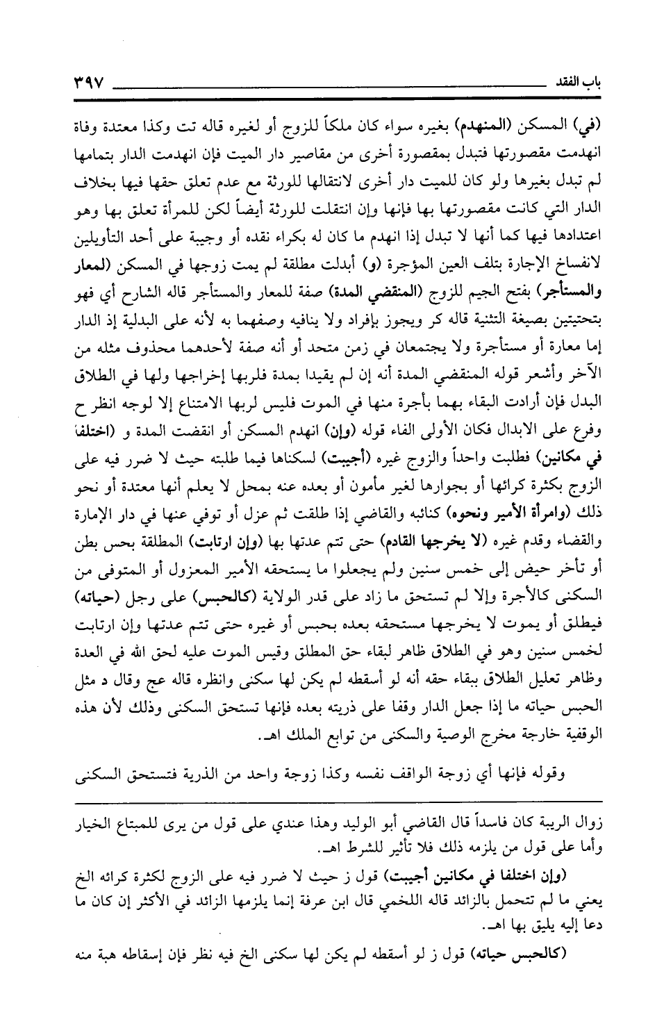(في) المسكن (المنهدم) بغيره سواء كان ملكًا للزوج أو لغيره قاله تت وكذا معتدة وفاة انهدمت مقصورتها فتبدل بمقصورة أخرى من مقاصير دار الميت فإن انهدمت الدار بتمامها لم تبدل بغيرها ولو كان للميت دار أخرى لانتقالها للورثة مع عدم تعلق حقها فيها بخلاف الدار التي كانت مقصورتها بها فإنها وإن انتقلت للورثة أيضًا لكن للمرأة تعلق بها وهو اعتدادها فيها كما أنها لا تبدل إذا انهدم ما كان له بكراء نقده أو وجيبة على أحد التأويلين لانفساخ الإجارة بتلف العين المؤجرة (و) أبدلت مطلقة لم يمت زوجها في المسكن (لمعار والمستأجر) بفتح الجيم للزوج (المنقضي المدة) صفة للمعار والمستأجر قاله الشارح أي فهو بتحتيتين بصيغة التثنية قاله كر ويجوز بإفراد ولا ينافيه وصفهما به لأنه على البدلية إذ الدار إما معارة أو مستأجرة ولا يجتمعان في زمن متحد أو أنه صفة لأحدهما محذوف مثله من الآخر وأشعر قوله المنقضي المدة أنه إن لم يقيدا بمدة فلربها إخراجها ولها في الطلاق البدل فإن أرادت البقاء بهما بأجرة منها في الموت فليس لربها الامتناع إلا لوجه انظر ح وفرع على الإبدال فكان الأولى الفاء قوله (وإن) انهدم المسكن أو انقضت المدة و (اختلفا في مكانين) فطلبت واحدًا والزوج غيره (أجيبت) لسكناها فيما طلبته حيث لا ضرر فيه على الزوج بكثرة كرائها أو بجوارها لغير مأمون أو بعده عنه بمحل لا يعلم أنها معتدة أو نحو ذلك (وامرأة الأمير ونحوه) كنائبه والقاضي إذا طلقت ثم عزل أو توفي عنها في دار الإمارة والقضاء وقدم غيره (لا يخرجها القادم) حتى تتم عدتها بها (وإن ارتابت) المطلقة بحس بطن أو تأخر حيض إلى خمس سنين ولم يجعلوا ما يستحقه الأمير المعزول أو المتوفى من السكنى كالأجرة وإلا لم تستحق ما زاد على قدر الولاية (كالحبس) على رجل (حياته) فيطلق أو يموت لا يخرجها مستحقه بعده بحبس أو غيره حتى تتم عدتها وإن ارتابت لخمس سنين وهو في الطلاق ظاهر لبقاء حق المطلق وقيس الموت عليه لحق الله في العدة وظاهر تعليل الطلاق ببقاء حقه أنه لو أسقطه لم يكن لها سكنى وانظره قاله عج وقال د مثل الحبس حياته ما إذا جعل الدار وقفا على ذريته بعده فإنها تستحق السكنى وذلك لأن هذه الوقفية خارجة مخرج الوصية والسكنى من توابع الملك اهـ.